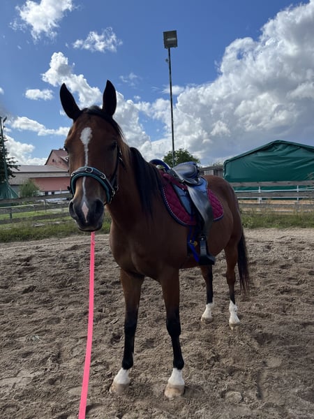Schweren Herzens geben wir unseren liebevollen Araber Wallach „Maverick“ ab. Er ist 7 Jahre alt und ca. 152 cm groß. Mave ist eher ein schmaler Kandidat, steht gerade auf den Beinen und hat einen schönen Huf. Vor einem Jahr haben wir ihn übernommen und wollten ihn gerne als Nachwuchspferd im Distanzsport ausbilden. Durch die ungeplant eingetretenen gesundheitlichen Umstände unsererseits fehlt leider die Zeit uns intensiv um ihn zu kümmern. Mave hat schon viel in seinem jungen Alter erlebt. Sowohl positives als auch negatives. Derzeit wird er bei uns nur vom Boden aus gearbeitet. Er kennt den Sattel, Gebiss/Trense, Doppellonge, Reitergewicht und auch den Schmied. Die Zähne wurden im Sommer auch gemacht. Im Umgang ist er ein lieber Kerl, er weiß aber auch wie er sich seinen Aufgaben entziehen kann. Weshalb er nur in erfahrene Hände abgegeben wird. Er kommt im Auslauf auch gerne zum kraulen und schmusen vorbei. Mave braucht einen festen Menschen der mit ihm durch dick und dünn geht, der sich die Zeit nimmt die er braucht. Ich freue mich über Anfragen, hinterlasst mir eine Telefonnummer und ich melde mich telefonisch bei dir!