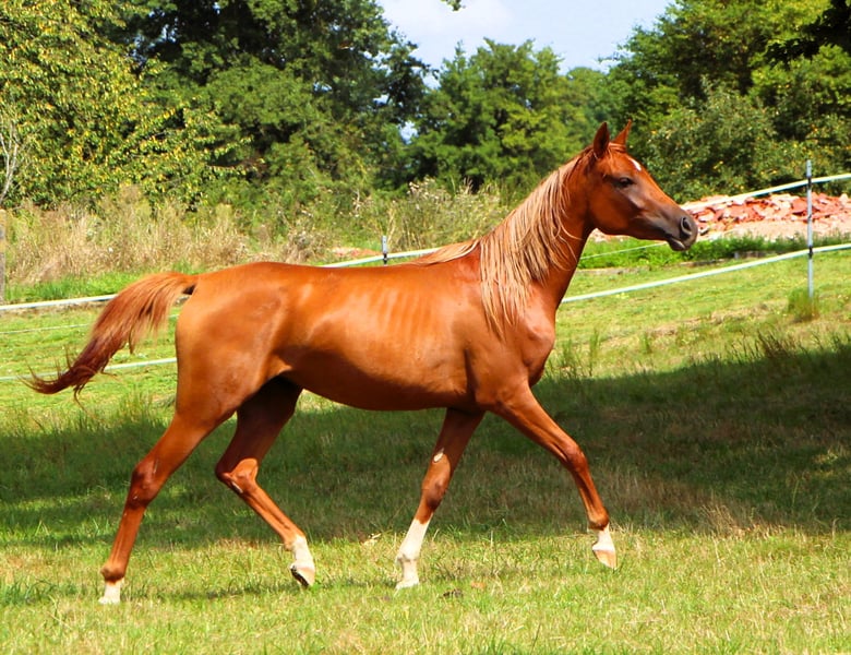Venus is a beautiful 2-year-old mare with a blonde mane. She is well-trained, knows how to be tied, groomed, have her hooves picked, and is familiar with the farrier... she loads into the trailer nicely and travels alone as well. She has already attended 2 shows where she received good evaluations. At the last show, specifically for performance horses, she secured the victory in her age class. No wonder, as not only did her mother compete in endurance, but her father, a grandson of Persik, was also extremely successful in long-distance events. Venus has a sweet character, enjoys spending time with her human, and learns very quickly. She must have inherited her wonderful character from her father. After all, which stallion covers a mare in the morning and then allows himself to be ridden one-handed in the afternoon during the Pentecost equestrian parade, with a large flag in the other hand!? Venus is located in Alsace in 67160 Siegen.