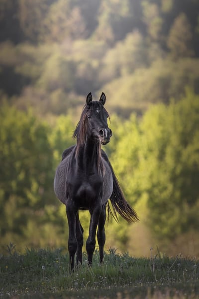 Ein schwarzes Fohlen, das im Feld steht — stark, neugierig, lebendig — und ihr Erbe weiterträgt.