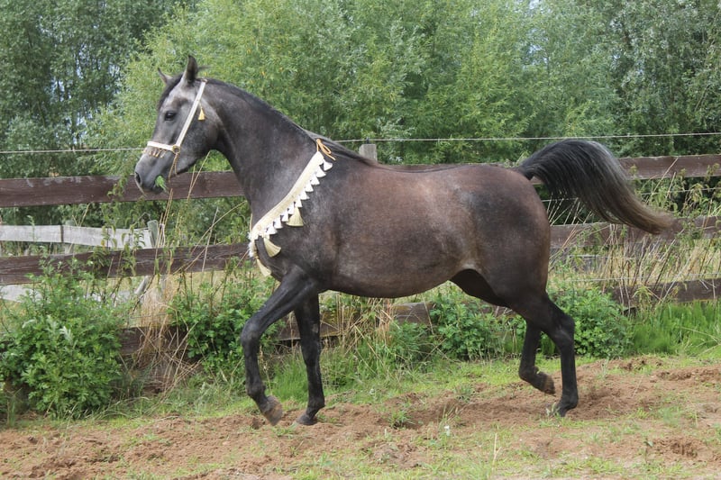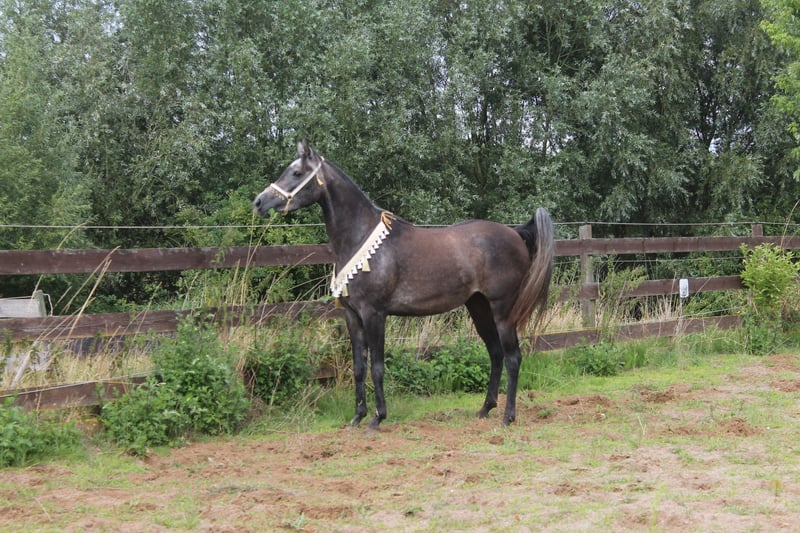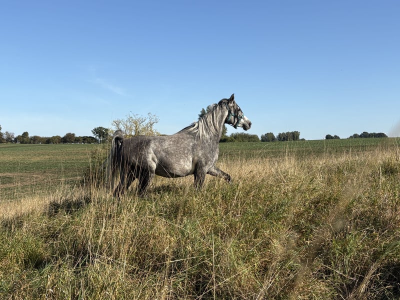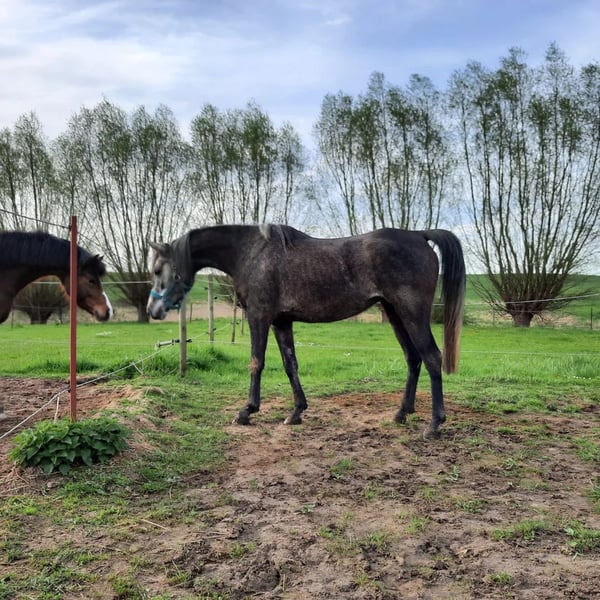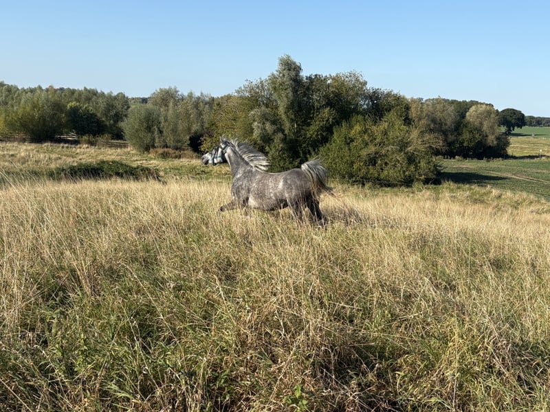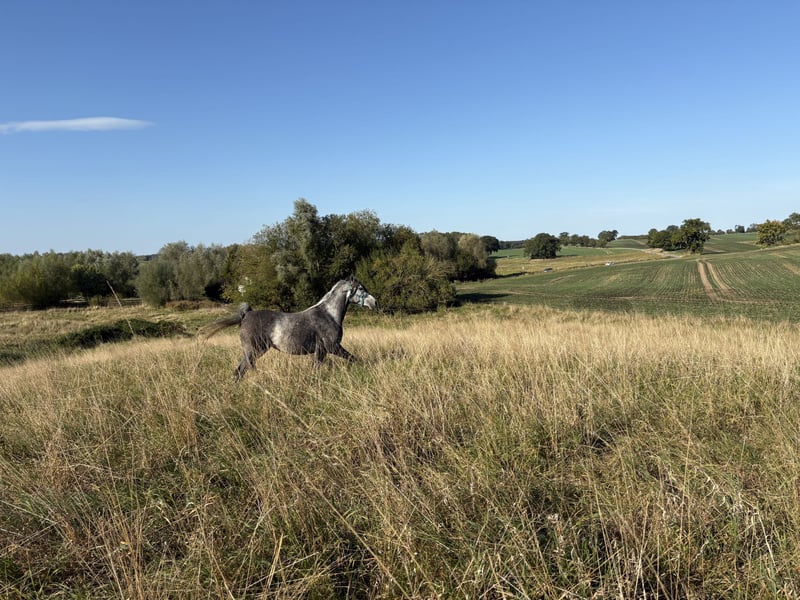 This beautiful and typy Arabian mare is looking for a new owner. She impresses with her friendly nature and easy handling. Her pedigree combines performance with beauty. Notably, she has a very elastic trot and a powerful canter. She is very expressive in movement, agile, and well-balanced. I can also easily imagine her excelling in Western riding. Despite her breed, she has a very calm and balanced temperament. She is very human-oriented, eager to learn, and, as mentioned, straightforward to handle. She was born here and raised in a herd. She is accustomed to box stall housing but is currently on pasture 24/7. Over the summer, she was gently backed at the farm but was interrupted as the trainer moved to southern Germany. Videos are available via WhatsApp! She stands approximately 15.5 hands tall.