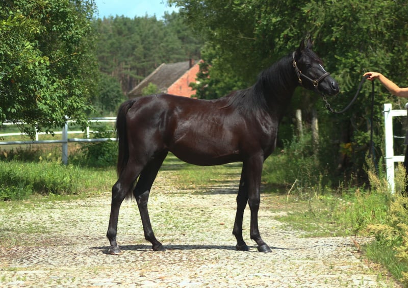 Beautiful, black homozygous 2024 colt looking for the best home! He is a nice young male, strong built with good movements. Final estimated height is approximately 157/158 cm; currently, he is 145 cm at 1.5 years old. Interesting old Polish bloodlines, mixed with the best Egyptian lines such as Thee Desperado, Bey Shah, Bey El Jamaal... Khalif is a prospect for breeding but mainly as a future riding companion for trails or endurance because of his top endurance sire's line (Wagram****, Palas****, Hadban Enzahi, etc.) and well-balanced and brave character. He is closely related to 120/160/210 km horses, for example: Ro Shy Moon - recent winner of the 160 km Dubai and speed record holder. Ro Patagonia - 3rd in CEN 160 km HH President Cup UAE. Half-brother Jaskier is a 2x winner in 120 km prestige races in UAE. His uncle Maestro (half-brother to sire) was 5th in CEI*** 160 km Castiglione Dl Lago and 13th in CEI*** 210 km Samorin. His aunt Sokolda (full sister of sire) was 2nd in CEI* 100 Schweich, 3rd in CEI** 120 km Fontenbleau. And many, many more world top horses!! Khalif is a very people-oriented horse, calm, easy, and very friendly. Curious and brave. Very well handled. His mother is a bombproof horse. Registered in PASB, DNA tested, microchipped, etc. Price + 8% VAT More info on WhatsApp +48 513 179 245 https://www.black-arabians.com/