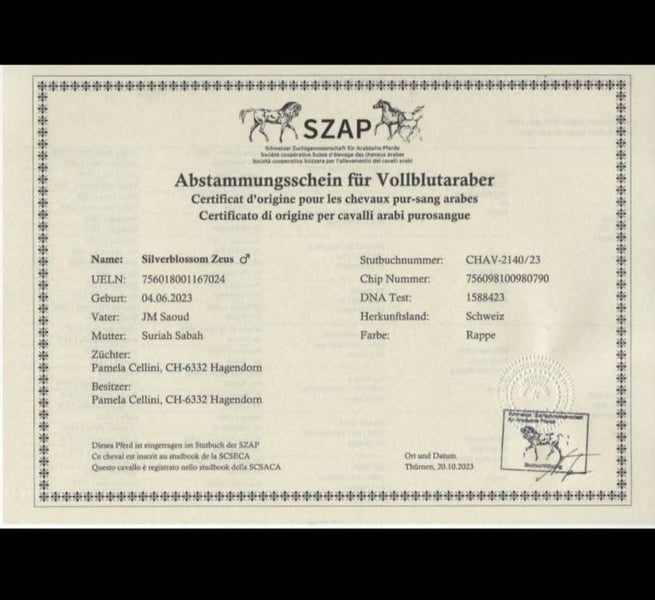 Silverblossom Zeus (*04.06.2023) ist ein homozygoter Rapphengst mit vier weissen Stiefelchen und 3/4 ägyptischer Abstammung. Der junge Vollblutaraber überzeugt durch sein elegantes Erscheinungsbild, raumgreifende Bewegungen und seinen freundlichen, menschenbezogenen Charakter. Er zeigt sich neugierig, lernfreudig und vielseitig einsetzbar – ob im gehobenen Freizeitbereich, im Sport oder später in der Zucht. Zeus kann sowohl als Hengst weiter gefördert werden als auch als Wallach ein hervorragender Partner werden (Kastration auf Wunsch möglich). Abstammung: Vater: JM Saoud – prämierter ZSAA-Rapphengst Mutter: Suriah Sabah – grossrahmige, sportliche Stute mit ausgeglichenem Charakter Standort: Schweiz – Transport kann organisiert werden.