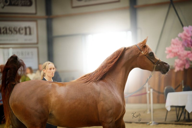 A Kanz of Kossack ist unser vielversprechender Hengst, geboren 2016 - 1,63m, von dem weltbekannten Kanz Albidayer (von Ajman Moniscione) aus unserer Elitestute Ariel (von Aja Shakakhan). Ein Kanz of Kossack hat bereits einen außergewöhnlichen Turnierrekord vorzuweisen: zweifacher nationaler Champion, Silber bei der Europameisterschaft der Züchter und viele weitere Goldmedaillen bei internationalen Schauen in Holland und Belgien! Er ist auch unter dem Sattel ausgebildet und zeigt ein extremes Talent für die Dressur, indem er bereits zwischen den Warmblutpferden auf Z-Dressur-Niveau gewonnen hat! Ausstellungsergebnisse von A Kanz of Kossack: - Bronzemedaille Champion Jährlingshengste, Tulip Cup, Int. B-Show, Ermelo, Holland 2017 - Goldmedaille Champion Jährlingsfohlen und BEST OF SHOW, Arabian Horse Weekend, Nat. Show, St. Oederode, Holland 2017 - Silbermedaille Champion Jährlingshengste (92,00 Punkte), AHO Breeders' Championship Europe, Chantilly, Frankreich 2017 - Goldmedaille Champion Jährlingshengstfohlen und Niederländisches Bestes gezüchtetes Pferd, Niederländische Meisterschaften, Ermelo, Holland 2017 - Top 5 Jährlingshengste, Arabian Futurity Europe, Aachen, Deutschland 2017 - Goldmedaille Champion Junior Colts, Europaschau, Brügge Arabian Horse Event, Belgien, 2018 - Goldmedaille Champion Junioren Hengstfohlen, Eurozone Cup, Exloo, Holland 2018 - Goldmedaille Champion Senior Stallions mit der höchsten Punktzahl der Show, Dutch Nationals, Exloo, Holland 2020 - WAHO-Trophy-Sieger 2023 Sportliche Ergebnisse von A Kanz of Kossack: - Champion AVS Online Dressur Wettbewerb 2020/2021 - L1 Dressur Niveau - Gesamtsieger AVS Online Dressurwettbewerb 2020/2021 mit einer Durchschnittsnote von 71,4%. - Niederländischer Landesmeister L Dressur 2021 - Champion AVS Online Dressurwettbewerb 2021/2022 - M1 Dressur - Gesamtsieger AVS Online Dressurwettbewerb 2021/2022 mit einer Durchschnittsnote von 70,8%. - Prädikat Dressur - ECAHO Niederländischer Nationaler Meister Dressur 2023 - Master Niveau - Champion Hunter Pleasure - Internationale Leistungsklassen Belgien Nationals 2023 - Champion Classic Pleasure - Internationale Leistungsklassen Belgische Meisterschaften 2023 - Derzeit erfolgreich in der Z2-Dressur und qualifiziert für die ZZ-Leicht-Dressur bei den Warmblütern Decktaxe für die Decksaison 2025: Euro 1.250,- ex. MWST. (Zuchtgebühr für andere Rassen auf Anfrage)