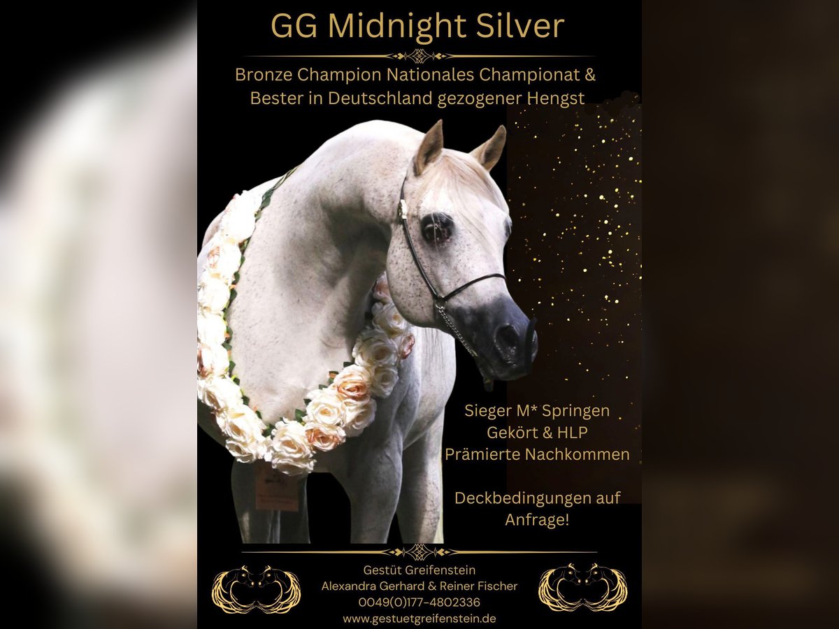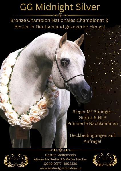 GG MIDNIGHT SILVER ist der Allrounder schlechthin! Gekört für alle Rassen und HLP absolviert. Im Sport erfolgreich und siegreich bis Klasse M. Nationaler Champion und Bester in Deutschland gezogener Hengst. Alle gezeigten Nachkommen wurden Prämiert. GG Midnight Silver steht einer limitierten Anzahl an Fremdstuten zur Verfügung. Nutzen sie diese Einmalige Gelegenheit!