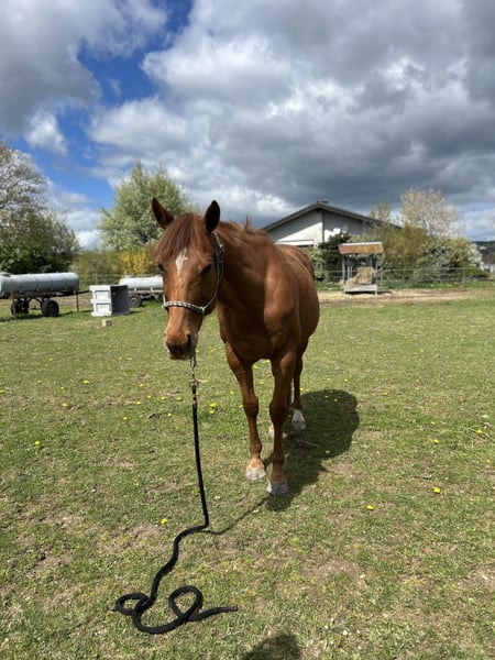 Nous réduisons notre troupeau et nous séparons donc de plusieurs chevaux vraiment sympathiques. Dans cette annonce, je vous présente Big Red. Nous l'avons acquis pour un autre hongre en tant que compagnon pour notre troupeau. Nous savons qu'il a été retiré de la piste (galopeur) à cause d'une fourbure de surcharge, et dans sa nouvelle maison, il a été beaucoup travaillé en liberté. Le clicker training lui est donc bien familier. Lors de son ancien élevage, il a également été monté en manège par des cavaliers expérimentés, mais je ne peux pas garantir cela. Je le vends en tant que compagnon de vie uniquement. Son caractère est très poli et respectueux. Il est dominant mais juste. Il peut tout à fait rester seul pendant un certain temps.