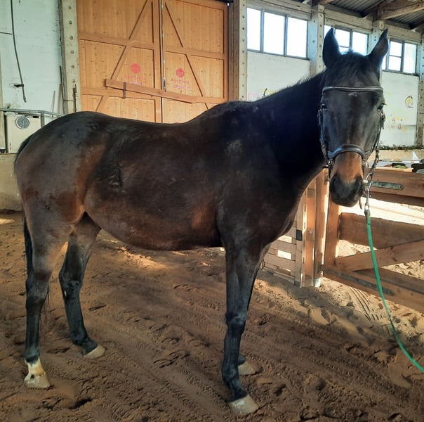 We are looking for a new home for our gelding. He is a 12-year-old dark bay gelding with three excellent basic gaits. He is comfortable riding alone or in a group, both in the arena and on outdoor rides. He is shoe-free and currently barefoot. He is kept in a mixed herd with an open stable system and 24/7 hay supply. He has been ridden recreationally by myself (37 years old) and my daughter (13 years old) both in the indoor arena and on trails. He is always well-behaved and manageable. He strives to please at all times and is eager to learn. Thanks to his friendly and charming nature, he is versatile and open-minded towards new challenges. We wish for him to find a new family that appreciates his kind and affectionate nature and will continue to support him. If interested or for further information, please feel free to contact me. Viewing and trial riding are possible by arrangement. He can be sold with complete tack if needed (saddle, bridle, blanket, etc.).