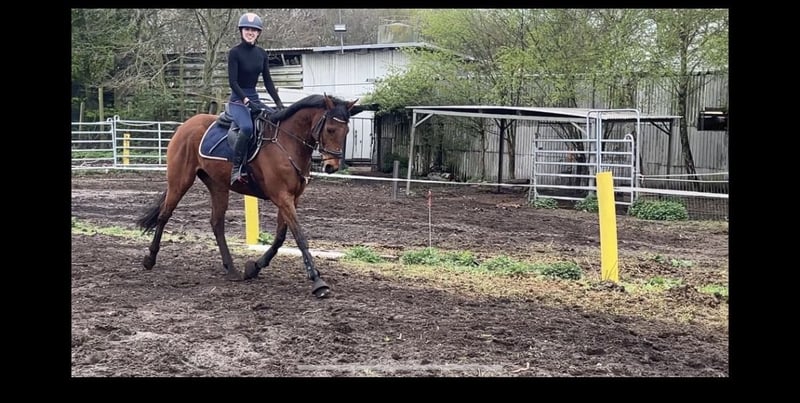 Hello, it is with a heavy heart that I am looking for a good new home for my Thoroughbred gelding, Papi. He will turn 13 years old in February, so he was born in 2013. He has never raced on the track. Papi is looking for someone who can firmly establish their opinion with him, but who remains loving and gentle. He is somewhat sensitive to his environment and has competed with me up to novice level (Class E) in dressage. It is important to note that he wears shoes with wedges, which he needs because otherwise he tends to stand somewhat flat-footed, leading to hoof abscesses. We have managed this well with the shoes. He has been shod with wedges for about a year now and handles it very well. He has not been regularly exercised for the past three years; I have only sat on him occasionally, but that’s all. The first reason was lameness caused by missing shoes, and later, I simply had too little time. Due to his lack of training, he is not available for trial riding.