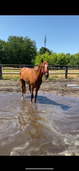 Mo is an absolute dream horse. If I had the time, I would definitely keep him myself. But he deserves a life where he plays the leading role. He ran one race for me and sustained a tendon injury. That was in June. Since then, he has been healing in the pasture with 5 other horses. He has been sound for many weeks now and can be used without hesitation as a leisure horse. He will also be able to do some light jumping, just no high-performance sports anymore. I taught him the basics of a "normal riding horse" when he was just 3 years old. Side passing, collection, backing up, and going forward and downward in self-carriage are second nature to him. I am looking for a lifelong home for him, as he needs a person to bond with and someone who loves him. I will really miss his whinnying every morning. He would go through fire for HIS person and is truly very trainable and eager to learn; he is still a teenager at just 4 years old.