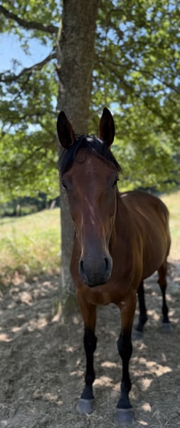 🐎 À vendre – Hongre Pur-Sang – 5 ans – toise environ 1m55-1m60 Hongre bien mis au 3 allures, passe des barres au sol, il a sauté en liberté ☺️ Très gentil, proche de l’homme et agréable au quotidien. Il sort seul ou accompagné en balade Peut vivre seul au pré comme avec d’autres chevaux ou au box, sortie paddock, obligatoire Polyvalent, il pourra convenir pour : CSO CCE Loisir sportif Balade ✔️ Manipulations & soins Transport OK À jour : maréchalerie, vermifuges, vaccins, ostéopathe