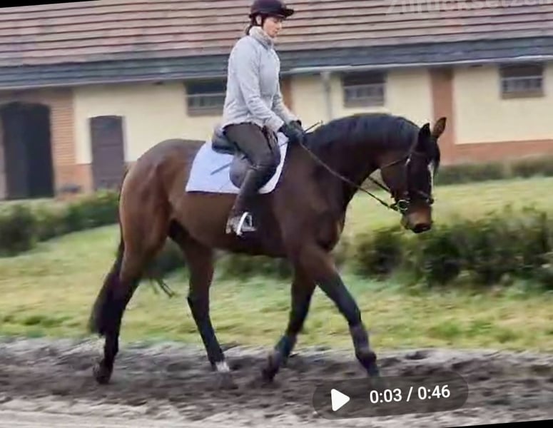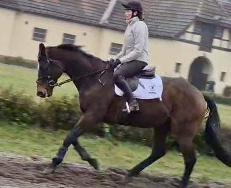 Er ist mit seinen 173cm Stockmaß für einen Vollblüter ein wahrhaft sanfter Riese. Für den Galopprennsport ist er einfach zu gemütlich und sucht daher einen Freizeitreiter, mit dem er durch dick und dünn gehen kann. Momentan wird er als Reitpferd umgeschult und zeigt sich dabei absolut lernwillig und gutmütig. Wir können uns ihn auch gut als Jagdpferd vorstellen. Er besitzt schwungvollen Grundgangarten und macht auch auf dem Reitplatz eine gute Figur. Da er sich nicht im Rennstall langweilen soll geben wir ihn deutlich unter Wert ab. Englisches Vollblut Geb. 2020 Wallach Braun 173cm Abstammung von Protectionist - aus der Anna Katharina
