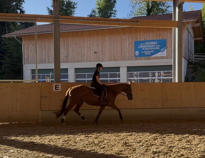 For sale is a beautiful English Thoroughbred mare, born in 2016. She impresses with her fearless character and her great attitude of always giving her all for the rider. The mare is currently used very reliably in the riding school for beginner and advanced lessons and has already enabled many students to achieve their riding badges. With a height of 156 cm, she is the ideal companion for leisure riders. She is well-trained and always shows motivation and willingness to learn. Whether for relaxed trail rides or work in the arena – this mare is versatile and impresses with her readiness to perform and pleasant temperament. The mare is kept in an open stable in a mixed herd but is also familiar with box housing. Betty would also be well-suited as a breeding mare, for example, for enhancing Warmblood breeding, as she has already had a great foal!