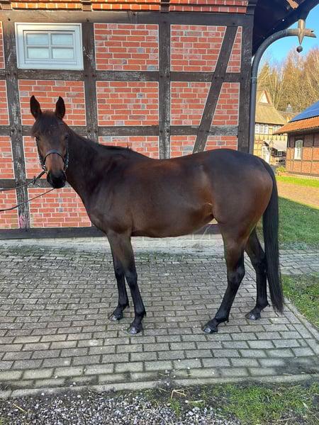 Elegant English Thoroughbred Mare for Sale Up for sale is a stunning dark bay English Thoroughbred mare. With an average height of 15.5 hands, she is the perfect companion for leisure riding and hobby riding. She is very well-behaved and eager to learn new things. Currently, she is housed in a box stall with four other horses. If interested and for further information, please feel free to contact me.