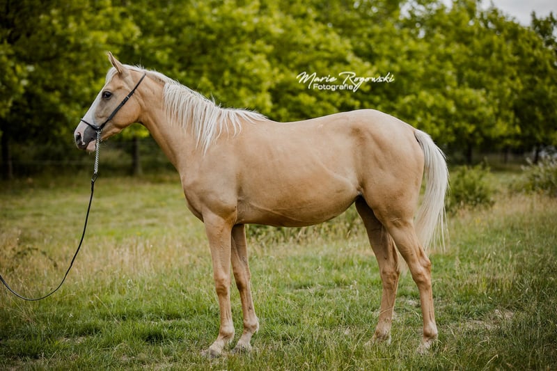 Jument | Pur-sang anglais | actuellement 156 cm | née en 2022 RICH 'N GOLD xx est une jeune jument harmonieuse et curieuse, à l'apparence claire et au physique bien proportionné. Elle se montre amicale, attentive et sociable et séduit par ses mouvements fluides et réguliers. Son père, TCF Palladium xx, est considéré comme le premier pur-sang Smoky Cream au monde et est apprécié pour ses membres corrects, son extérieur harmonieux et son caractère fiable. Sa mère, Riches xx, apporte à sa descendance une santé robuste, un tempérament calme et une expérience de l'élevage. RICH 'N GOLD xx combine ainsi des mouvements harmonieux, une ascendance remarquable par sa couleur et un caractère amical et disposé à apprendre chez un jeune cheval.