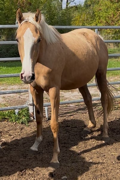 Palomino Volbloed merrie met W20-gen komt niet zo vaak voor. Normaal gesproken is deze merrie veel waard, maar ze heeft een handicap die rijden en ook de fokkerij beperkt! We hebben haar moeder hier in de fokkerij, evenals drie andere broers en zussen! Voor meer informatie, neem gerust contact op!