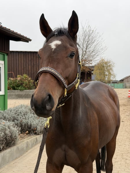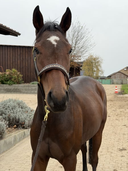 Schweren Herzens verkaufen wir hier unsere fast 4-jährige, selbstgezogene Vollblutstute. Dandelion ist am 07.04.2022 auf dem Gestüt Erftmühle geboren und aufgewachsen. Sie befand sich bis vor kurzem im Renntraining, hat aber aus persönlichen Gründen den Rennstall rundum gesund und unverletzt verlassen. Dies kann natürlich gerne im Rahmen einer Ankaufsuntersuchung überprüft werden. Sie ist keine Rennen gelaufen. Wir möchten sie nun am liebsten in den Freizeitbereich, gerne aber auch an einen ambitionierteren Reiter verkaufen. Ich könnte sie mir gut in der Vielseitigkeit oder der Distanz vorstellen. Ihre Mutter, Dolasilla, geht mit ihrer 15-jährigen Reitbeteiligung regelmäßig auf Geländekurse und zeigt sich dabei unglaublich talentiert, sie ist wendig und schnell und hat eine tolle Manier am Sprung (siehe die beiden letzten Bilder). Dies hat sie sicherlich an ihre Tochter vererbt. Dandelion ist vollbluttypisch voller Energie und möchte gerne arbeiten, hat mit ihren fast 4 Jahren aber natürlich noch nicht viel gesehen. Wir üben gerade ruhig am Anbinder zu stehen, alleine spazieren zu gehen und erste Grundlagen der Bodenarbeit am Kappzaum. Dort zeigt sie sich sehr intelligent und hat schon eigene, sehr gute Ideen. Neue Situationen findet sie oft noch aufregend, wird dabei aber niemals kopf- oder respektlos. Zudem zeigt sie keinerlei Unarten. Im Grunde ist sie ein ganz normales, junges Pferd, welches noch sehr viel lernen muss und möchte. Außerdem ist sie unglaublich verschmust, wird gerne am ganzen Körper gekrault und kommt sofort angelaufen, wenn man sie ruft. Ich bin mir sicher, dass sie ihren zukünftigen Menschen sehr glücklich machen wird und viel Potential für sämtliche Sparten des Reitsports hat. Dandelion ist nun ca. 1,63m groß und wird sicherlich noch ein ganzes Stück wachsen.