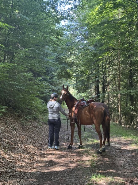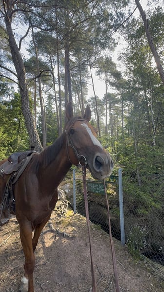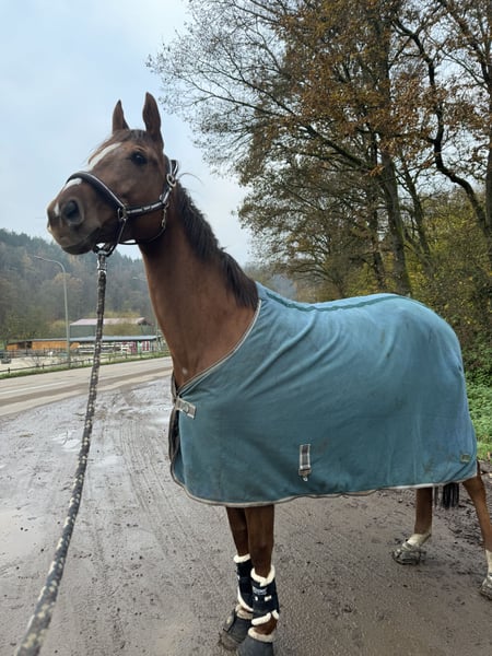 With a heavy heart, we are selling our Silvi if the perfect home arises! Key data: Silvretta - Sire: Buratino, Dam: Schesaplana Breed: Thoroughbred Born: 11.02.2020 Raced 2-4 years, ended racing career uninjured Approx. 1.63 m. DNA Test MIM-6 Vor. (formerly PSSM2) - Result n/PX heterozygous Our Silvi is ideal for leisure activities and has a friendly and open personality. In the terrain, she has a pleasant go but is always manageable. In the arena, she has a solid basic training and has gained a lot of enjoyment in jumping. I would not sell her as a pure beginner/children's horse. Last winter, we had her blanketed with a 600g rug and a neck cover; she will need this as she does not grow a winter coat. Currently, she is kept with a mare and two geldings in a paddock and gets along well with everyone. Not a forced sale! If you are interested or have further questions, we look forward to your message!