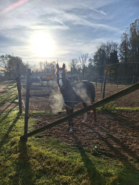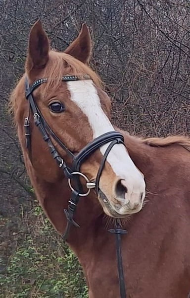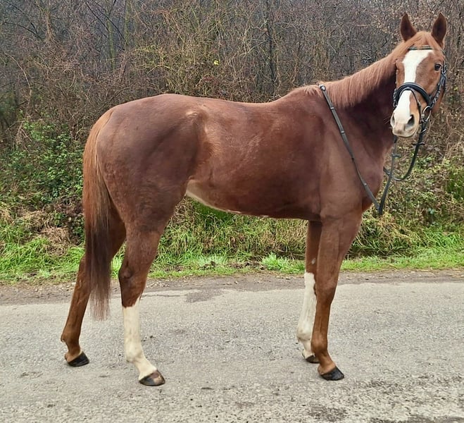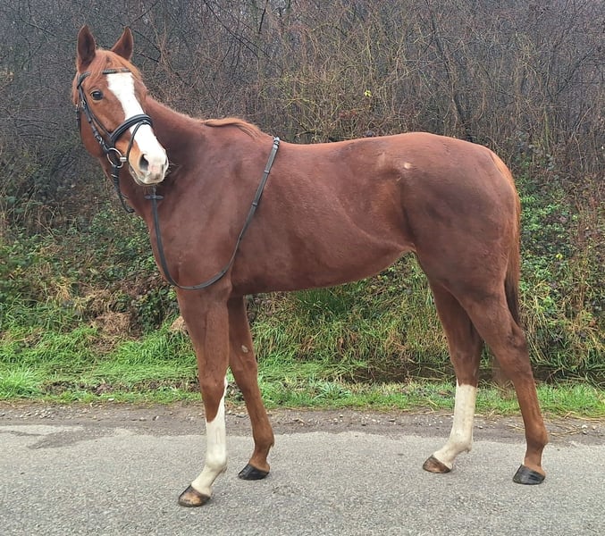 We are selling "First Fly" on behalf of her owner. She is a 16.0 hh chestnut mare with three good basic gaits and initial experience in free jumping. First Fly joined our riding facility in November after winning a race earlier this year. We have provided her with a varied program so far, including riding, lunging, free jumping, and daily turnout in the paddock. Her retraining is still ongoing but well underway. Therefore, we are looking for an experienced rider familiar with Thoroughbreds. The mare has clean legs and has never been injured to date. She is shod in front. Her sweet and friendly nature is particularly noteworthy, also towards her stablemates. Further information gladly available by phone: 0172-6523358. First Fly is neither a children's pony nor an beginner's horse.