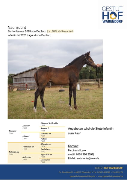 Infantin jest młodą klaczą pełnej krwi, która nie brała udziału w wyścigach, lecz została odpowiednio wytrenowana do sportu jeździeckiego (obecnie poziom A). Jest potwierdzona jako matka i w kontaktach z ludźmi jest czujna i łatwa w obsłudze. W 2024 roku rozpoczęła karierę hodowlaną i w 2025 roku urodziła swoje pierwsze bardzo ładne źrebię (klaczka od Duplexx). Po tym wydarzeniu została ponownie zapłodniona Duplexxem w 2025 roku. Ponieważ linia I obejmuje kilka klaczy, a teraz klaczka Infantin wzbogaciła stado hodowlane w stadninie Hof Warendorf, Infantin jest wystawiona na sprzedaż.