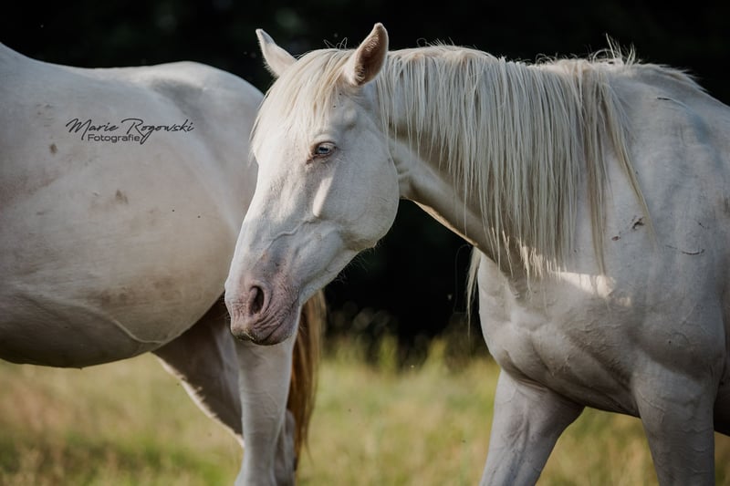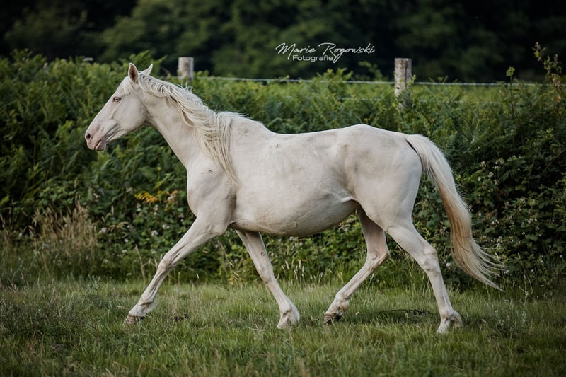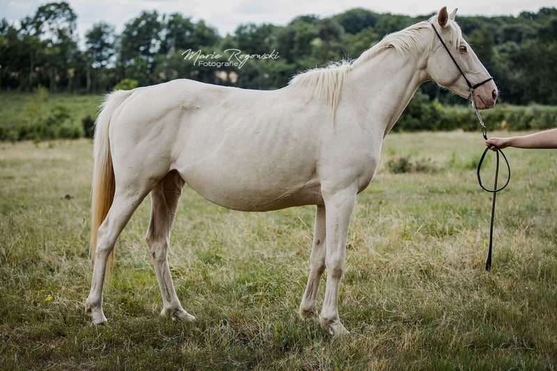 Englisches Vollblut | Cremello (e/e Cr/Cr) | geb. 2016 | 153 cm Diese farblich außergewöhnliche Vollblutstute stammt aus einer gezielt selektierten Farbzuchtlinie. Ihr Vater Glitter of Gold und ihre Mutter Dressed in Gold gehören zu einer seltenen Blutlinie im Vollblutbereich, in der das doppelte Cream-Gen (Cremello) gezielt erhalten wurde. DRESSED IN CREAM xx ist reinerbig für das Aufhellungsgen und damit genetisch besonders interessant für Zuchtprogramme mit Fokus auf Farbe, Edelblut und sportlichem Typ. Sie bietet eine seltene Kombination aus klassischer Vollblutqualität und moderner Genetik. Die Stute ist derzeit nicht geritten und lebt im Offenstall in einer gemischten Herdenhaltung.