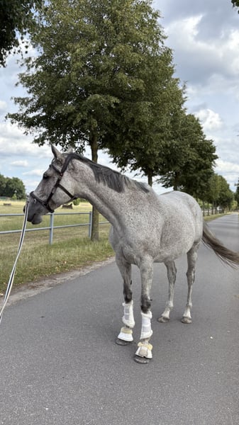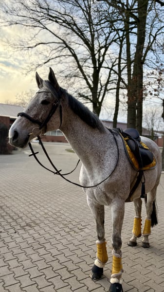 With a heavy heart, I am offering my 9-year-old Thoroughbred mare, Monta Rare, for sale. Unfortunately, we haven't been able to find a common rhythm in riding for the past four years. Monta is an Irish Thoroughbred, born April 2017, standing 16.1 hh. She is naturally a nervous type of horse, so she needs a rider with a gentle touch but also confident leadership and consistency. She is very willing in the outdoor environment, whether alone or in a group, but prefers to be towards the front. She knows the indoor arena and riding ring but prefers outdoor riding. Jumping is her forte, although she hasn't been extensively trained in it. I also see her as a potential eventer, as she is very fearless over jumps. Overall, her training as a racehorse has left her with a few quirks: she tends to overreact to leg aids and wants to move forward quickly, but these are manageable with training. She works very willingly and learns quickly. She is not a spooker or difficult to handle, always manageable. Currently, she is kept in box stalls with daily turnout on pasture or paddock within a herd. • May 2025: laminitis due to incorrect hoof care, since then she has front shoes • April 2025: blood test revealed selenium deficiency, which is now supplemented • Farrier and veterinarian visits are no problem • Loading is not her favorite, but she stands very calmly during transport She is sold with her jumping saddle and bridle. (For an additional fee, her entire tack collection can also be included, including blankets, saddle pad, bell boots, and leg wraps – she has almost everything! ;) ) To prevent trial riding for resale purposes, I will charge €20 for a test ride, which will be deducted from the purchase price. Serious buyers are welcome to multiple test rides at no extra cost, by arrangement. Price is negotiable; my main priority is that she goes to a good home.