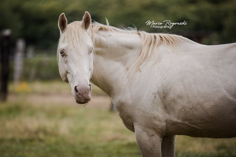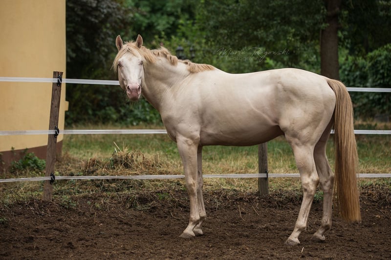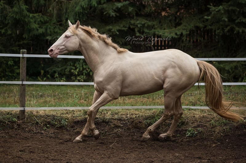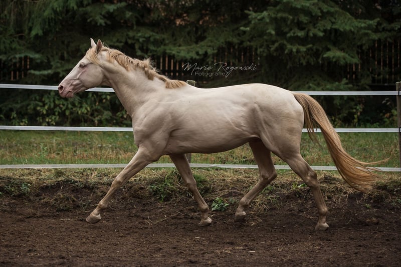 Caballo de pura raza inglesa en Smoky Cream (doble dilución) | nacido en 2010 | 1,60 m | caña 22 cm Inscrito en el Studbook de la Asociación de Cría de Pura Raza Inglesa de Alemania (2011) Reconocido por ECHA-ESV (2012), EASP Países Bajos (2015), ANAA / IFCE Francia (2017/2022), AES (2020), France Galop (2024), Zangersheide Genética: E/e a/a Cr/Cr Testado para WFFS, CA, SCID, PSSM2 – negativo El TCF Palladium xx fue el primer pura raza inglesa Smoky-Cream nacido en el mundo. Proviene de la True Colours Farm en Canadá (cría: Guaranteed Gold xx x yegua de Red Fox Farm) y fue importado a Alemania en 2011. En 2012, obtuvo su primera reconocimiento en la categoría de sementales del Libro I con una nota de tipo de 9,0. Destaca por su estructura correcta, un físico equilibrado y su carácter confiable. Debido a su particularidad genética, es ideal para potenciar líneas de caballos de sangre caliente y de cría mixta, especialmente en la cría de color. Su descendencia está presente en diversos programas de cría en Europa, mostrando un aspecto moderno, armonioso y colorido. Tras un accidente que le causó lesiones en las patas delanteras, Palladium ya no puede trotar con claridad. Sin embargo, no siente dolor y sigue moviéndose con gusto. No hay impedimentos para su uso en la reproducción.