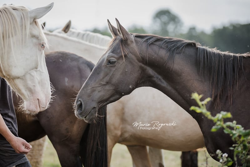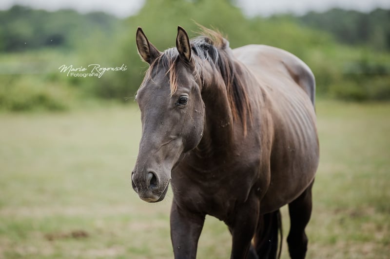 Pur-sang anglais en Smoky Black | né en 2021 | actuellement en croissance Pur-sang anglais de race Génétique : E/_ a/a Cr/n LWO/n Roi De Messina xx est un jeune étalon pur-sang avec une génétique de couleur rare : un noir éclairci (Smoky Black) avec un gène crème et porteur du gène Overo (LWO/n). Actuellement, il se montre plutôt timide et prudent dans ses interactions, tout en restant attentif et intéressé. Il grandit de manière appropriée dans un groupe de jeunes étalons d'âges mélangés, connaît un contact régulier avec les humains et est familiarisé avec les routines de base du quotidien. Père : T.C.F. Palladium xx – l'un des rares pur-sang de couleur smoky-cream au monde, élevé au Canada (True Colours Farm). Mère : Remarque in Gold xx – jument pur-sang anglaise de couleur palomino issue d'une lignée américaine. Roi De Messina xx allie une génétique particulière à un type classique de pur-sang. Convient à des propriétaires responsables, patients et sensibles aux chevaux délicats.