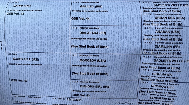 Cavalla purosangue di cinque anni, con genealogia di altissimo livello, proveniente dall'Irlanda