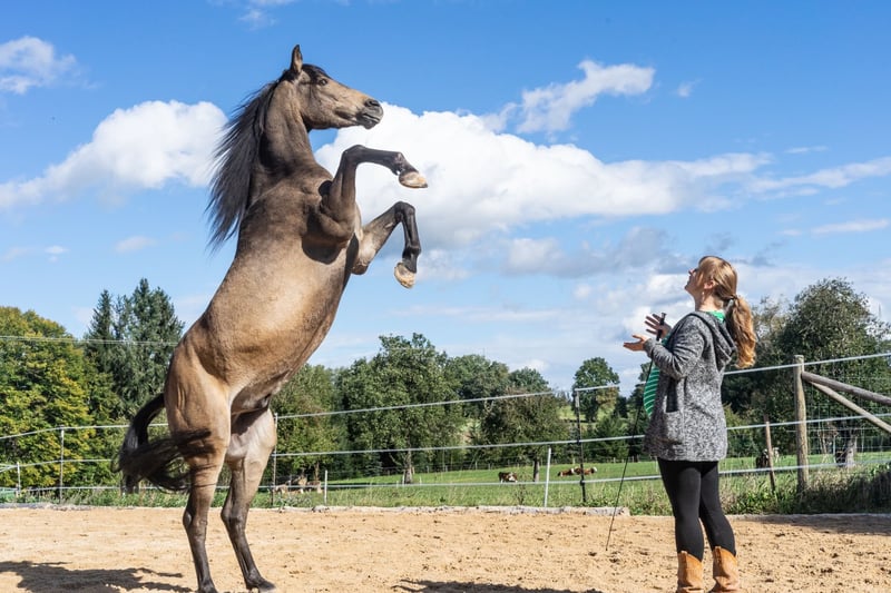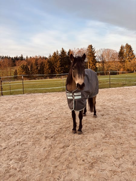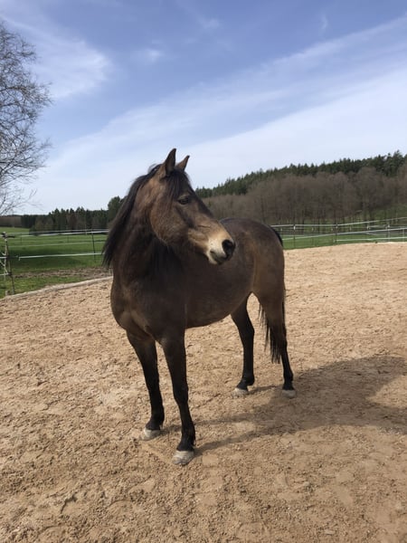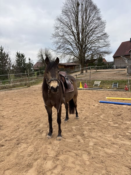 Schweren Herzens suche ich für meinen 12-jährigen Quarab Wallach ein passendes, erfahrenes Zuhause. Er ist 1,45m groß und daher kein Gewichtsträger (max 70kg). Ich habe ihn als Jährling gekauft und ihn 5-jährig schonend angeritten. Er ist ein sehr intelligentes, sensibles Pferd, das mit großer Freude lernt und besonders in der Bodenarbeit sowie in der Freiarbeit aufgeht. Er beherrscht zahlreiche Lektionen wie Schulterherein, Travers, Revers, Plié, den spanischen Schritt sowie erste Ansätze der Piaffe. Auch die Freiarbeit und Zirzensik machen ihm große Freude und gehören zu seinen Stärken. Unter dem Sattel zeigt er sich auf dem Platz eher ruhig und bemüht, alles korrekt umzusetzen. Im Gelände hingegen blüht er richtig auf und zeigt deutlich mehr Motivation und Freude an der Arbeit. Sein kluger Kopf ist Fluch und Segen zugleich: Er lernt sehr schnell – sowohl Gewünschtes als auch Ungünstiges. Daher benötigt er eine klare, ruhige und konsequente Führung durch eine erfahrene Person. Er hat eine ausgeprägte Persönlichkeit, steht täglich für sich ein und kann in seinen Reaktionen impulsiv sein. Dies kann sich in seltenen Situationen durch Losreißen (teilweise mit Erfolg), Steigen, Wegdrehen oder Drohverhalten äußern. Gesundheitlich ist er leichtfuttrig und benötigt ein angepasstes Futtermanagement mit begrenztem Zugang zu Heu und Weide. Mit vier Jahren hatte er einen leichten Reheschub; Röntgenbilder sind vorhanden, es kam dabei zu keiner Rotation oder Absenkung. Zudem hat er sehr empfindliche Haut und wird im Sommer mit Fliegendecke geschützt. Aufgrund seiner hohen Körperspannung benötigt er im Winter ebenfalls eine Decke, um die Rückenmuskulatur warm zu halten. Ich wünsche mir für ihn ein Zuhause in Offenstallhaltung bei Menschen, die seine besondere Art zu schätzen wissen und ihm mit Ruhe, Klarheit und Erfahrung begegnen können. Für den richtigen Menschen ist er ein unglaublich spannender Partner mit viel Potenzial und Ausdruck. Ein passender Vollmaßsattel ist vorhanden und kann bei Interesse gerne miterworben werden. Selbstverständlich werden alle 6 Wochen die Hufe bearbeitet (er läuft barhuf und im Gelände mit Hufschuhe), Zähne werden jährlich kontrolliert, regelmäßige Kontrolle durch Osteo, Physio und Sattlerin. Der Preis ist verhandelbar. Ein gutes Zuhause wäre mir viel wichtiger. Bei Fragen meldet euch gerne bei mir.