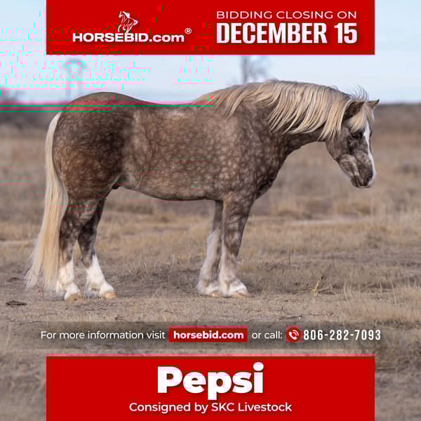 🎄𝐓𝐇𝐄 𝑯𝒐𝒍𝒊𝒅𝒂𝒚 𝐂𝐋𝐀𝐒𝐒𝐈𝐂🎄 Happening now thru MONDAY | DECEMBER 15th - Available EXCLUSIVELY on HorseBid's website! For more details and to register visit: www.Horsebid.com CONSIGNOR CONTACT: SKC Livestock 806-282-7093 LOCATION: Canyon TX BREED: Quarter Pony REGISTERED: No COLOR: Gray HEIGHT: 13 AGE: 7 GENDER: Gelding 🥤 Pepsi 🥤 🌟 Fancy 7-Year-Old Dapple Grey Gelding Pony – 13 Hands, Built Like a Big Horse! 🌟 If you’re looking for a solid, dependable, kid-friendly pony with the build and heart of a big horse , look 👀 no longer !! Pepsi is a 7-year-old dapple grey gelding. Standing 12.2 hands, Pepsi is stout with a big hip, correct conformation, and built to last. This little gelding is the whole package—looks, brains, and a work ethic that doesn’t quit. ✨ Ground Manners & Handling He is an absolute gentleman on the ground. Easy to catch, stands for grooming and baths, and is great with his feet. He curbside mounts like a pro, making it simple for little riders to get on independently. Quiet, patient, and respectful—exactly what you want in a kids’ pony. 🐄 Ranch, Trail & Cow Work Pepsi has been used on the ranch alongside the big horses and has no trouble keeping up. He has been been used outside on a cow calf operation and has had a real working job . He loads right in with them and is always ready to work. He has helped move cattle, and nothing phases him—busy alleys, quick turns, new environments, he handles it all. Our 4-year-old son has chased roping steers up and down the alleys on him with zero issues. He has also been used at the sale barn penning back cows and knows how to handle himself around livestock. 🏇 Riding Ability & Kid-Safe Pepsi takes time off well no matter if you ride him once a day or once a month he is the same pony ! He rides off alone with confidence and no hesitation. Our 8-year-old daughter has been roping the hot heels on him and also enjoys riding him English—he takes everything in stride and aims to please. This pony is the real deal for a family wanting a trustworthy, versatile mount for their kids. 💯 Overall Dependable, athletic, gentle, and trained—this gelding is ready to step into your program and make a kid very happy. Suitable for ranch chores, arena play, English riding, or being a safe and steady partner for young riders. A rare find with the size, build, and brain everyone is looking for. For more information call or Text Cheyenne at +18062827093
