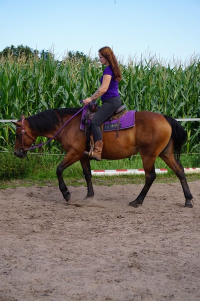 Hello, with a heavy heart, I am selling my Connemara/Quarter Horse mare. Height: 1.51 m (approximately 15.0 hands) Age: 12 years Rank: Middle - in her previous stable, she was lower in the hierarchy; in her current stable, she is higher-ranking. Suitable for ambitious leisure riders. Unfortunately, I simply do not have enough time for her. She needs someone who can train her regularly. Ivy is a sporty horse with plenty of go, eager to be worked and challenged. She has been ridden English for many years and has been ridden Western for the past two years. She is up for any fun activity and enjoys everything, especially sporty disciplines like jumping, speed rodeo, endurance riding, but also trail riding, lasso work, or archery. On the longe, she prefers to move at a trot, and under saddle, she enjoys galloping the most. Sometimes she can be a bit more spirited, but always within a manageable level. Even when she is a bit excitable, she always looks after her rider. Ivy has mainly been ridden in the field, as well as in unfamiliar indoor arenas. We have participated in Western competitions and attended many training courses. Currently, she is not in training, as I simply do not have the time, which is one of the main reasons for her sale. She is not a children's pony, although she was ridden once a week here by an 11-year-old girl, both on the longe and under saddle. The girl also does groundwork and longeing with her alone. She spent years in a box at night and outside during the day, and for the past nearly two years, she has been in a pasture turnout. She is familiar with hay and haylage. She also knows her surroundings well – dogs, sheep, tractors, etc. She is somewhat sensitive to insects but shows no signs of eczema. We protect her with a blanket or use a fly mask during heavy midge periods, especially during training. She is healthy and has never had any issues with me. Farrier and loading are no problem.