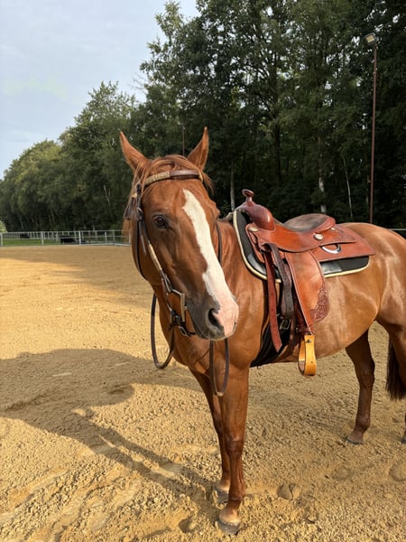Quarter Horse Stute – Freizeitpferd mit Zuchtpotenzial Zum Verkauf steht unsere reinrassige Quarter Horse Stute „Bailey“, 16 Jahre alt mit einem Stockmaß von ca. 1,54 m und guten Papieren. Ihr Vater ist der bekannte Coosa Skippin Gold. Bailey ist 5-Panel negativ getestet. Bailey ist ein sehr fairer und ausgeglichener Charakter. Sie ist ein eher gelassener Typ, dabei aufmerksam und klar im Kopf – nicht kopflos oder hektisch. Im Gelände zeigt sie sich sehr zuverlässig und geht auch problemlos alleine ins Gelände. Im täglichen Umgang ist sie anständig und respektvoll – sie beißt nicht, tritt nicht und zeigt keine Unarten. Gleichzeitig ist sie kein typisches Kuschelpony, das ständig betüddelt werden möchte, sondern bevorzugt einen ruhigen, klaren Umgang. Beim Reiten ist Bailey eher sensibel, weshalb sie nicht hauptsächlich für Anfänger geeignet ist. Sie passt besser zu einem Reiter mit etwas Gefühl und Erfahrung. Bailey hatte bereits ein Fohlen und eignet sich daher auch als Zuchtstute, wird aber ebenso als Reitpferd verkauft. Sie wurde in letzter Zeit etwas weniger geritten, kennt aber natürlich weiterhin ihre Grundlagen. Zubehör kann auf Wunsch mit erworben werden, darunter auch hochwertiges Westernzubehör wie ein guter Westernsattel. Besonders hervorzuheben ist ihr großes Potenzial in der Bodenarbeit und Freiarbeit. Sie kennt bereits verschiedene Übungen, reagiert sehr fein auf die Stimme und arbeitet aufmerksam mit dem Menschen zusammen. Außerdem hat sie bereits verschiedene Gelassenheits- und Schrecktrainings kennengelernt. Abstammung: Bailey ist eine reinrassige AQHA Quarter Horse Stute mit guter Abstammung. Ihr Vater ist der bekannte Hengst Coosas Skippin Gold, der aus der erfolgreichen Coosa-Linie stammt. Diese Linie ist besonders für typvolle Quarter Horses mit ruhigem, menschenbezogenem Charakter und guter Arbeitsbereitschaft bekannt Daten auf einen Blick: • Reinrassige Quarter Horse Stute • Name: Bailey • 16 Jahre • Farbe: sorrel • ca. 1,54 m Stockmaß • gute Papiere • Vater: Coosa Skippin Gold • 5-Panel negativ getestet • bereits Mutterstute gewesen • geht alleine ins Gelände • fairer, gelassener Charakter • sensibel beim Reiten → nicht hauptsächlich für Anfänger Sie kann problemlos verladen werden, geht regelmäßig zum Hufschmied und Zahnarzt. Steht aktuell in einem Offenstall- sie ist rangniedrig. Bailey wird nur in passende Hände abgegeben! Bei ernsthaftem Interesse gerne melden. Videos auf Anfrage