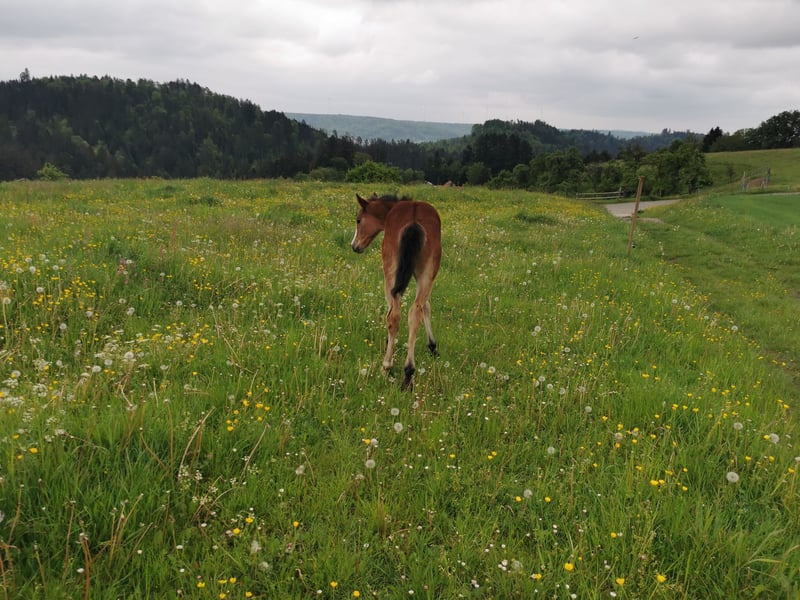 "Finest Lilo", auch Liselotte genannt, kam am 28. März als Erste unsere 3 Stutfohlen in 2024 zur Welt. Sie begeistert uns von erste Sekunde an durch ihre ausdrucksstarke Erscheinung. Sie ist neugierig aber nicht aufdringlich und punktet durch den Quarter Pony-typisch, vitalen und athletischen Körperbau. Ihre vier älteren Vollgeschwister Laslo, Limo, Lina und Lino aus derselben Anpaarung lassen bei ihren neuen Besitzerinnen keine Wünsche offen und sind sehr leicht auszubilden. Lipari's erste 3 Fohlen sind Palominos, Lino ist ein Fuchs und Liselotte nun eine wunderschöne Braune! Daher haben wir unsere Haflingerstute Lipari wieder mit dem europaweit bekannten und sehr erfolgreichen Quarter-Horse Hengst "EH One Of Lena's Finest" vom Eliesenhof verpaart. Lilo's Elterntiere sind auf 5- und 7-Panel-Test N/N getestet. Liselotte's Mutter, "Lipari" ist aus einer ganz besonderen Haflingerlinie gezogen mit 0% Araber-Anteil, welche sogar von den Südtirolern gefragt ist. Also noch aus der älteren schwereren Linie und trotzdem hat sie eine sehr stimmige Erscheinung mit feinem Kopf und strotzt vor Vitalität. Die Sturheit, die man Haflingern gerne nachsagt, kann ich hier nicht bestätigen. Zurück zu Lilo: Sie ist beim ZSSE e.V. als Quarter-Pony eingetragen und besitzt selbstverständlich einen Equidenpass. Das geschätzte Endmaß beträgt vermutlich 1,50cm+. Liselotte hat jetzt schon ein beachtliches Stockmaß von 1,45cm. Sie zeigt ein starkes Fundament und ist somit später somit auch gut als Reitpferd für Erwachsene geeignet. Sie wurde bisher gechipt und regelmäßig entwurmt und bekam zum Jahreswechsel die Tetanus-Impfung. Pferdehänger-Fahren zusammen mit ihrer Mutter kennt sie schon. ***Wir züchten jedes Jahr 2-3 Quarter-Ponys*** Unsere Fohlen dürfen artgerecht im Herdenverbund auf 10ha Weideland und im Aktivstall unter besten Voraussetzungen und lückenlosen Überwachung nach Bioland-Bedingungen aufwachsen. Da auch unsere Kleinkinder täglich mit im Stall sind, legen wir Wert auf umgängliche, nervenstarke Pferde. Außerdem lernen unsere Fohlen auch von klein auf andere Tierarten kennen, wie z.B. bei der Mischbeweidung mit unseren Rindern und sind daher schon früh sehr souverän. Durch guten täglichen Umgang lernt unser Nachwuchs nach dem Absetzen in wenigen Tagen das Fohlen-ABC. Durch ihr großes Vertrauen zum Mensch folgen sie uns schon als junge Fohlen problemlos in den Hänger und Co. - also beste Natural Horsemanship Voraussetzungen! Bei uns besteht also die Chance ein "rohes", unverbrauchtes Pferd ohne schlechte Erfahrungen zu bekommen, welches leicht nach den ganz eigenen Bedürfnissen ausgebildet werden kann. Für Lieselotte's Zukunft wünschen wir uns zukünftig ein förderfähiges aber vor allen Dingen artgerechtes neues Zuhause! Für diese Jährlingsstute und sympathische Neubesitzer besteht die Möglichkeit, dass sie noch einige Jahre bei uns am Hof eingestellt werden kann. Preisverhandlungen sind möglich und werden vor Ort geführt. Bei Interesse an Lilo freu ich mich über einen Anruf oder eine Nachricht, gern auch per Whatsapp 0176 56798081