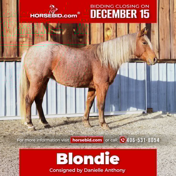 🎄𝐓𝐇𝐄 𝑯𝒐𝒍𝒊𝒅𝒂𝒚 𝐂𝐋𝐀𝐒𝐒𝐈𝐂🎄 Happening now thru MONDAY | DECEMBER 15th - Available EXCLUSIVELY on HorseBid's website! For more details and to register visit: www.Horsebid.com CONSIGNOR CONTACT: Danielle Anthony 406-531-8054 LOCATION: Hamilton, MO BREED: Quarter pony REGISTERED: No COLOR: Silver Red Roan HEIGHT: 13.1 AGE: 8 GENDER: Mare 🌸 BLONDIE – Gorgeous 8-Year-Old Silver Red Roan Quarter Pony Mare 🌸13.1 Hands | Fancy Mover | Versatile & Talented | Located in Hamilton, MT Meet Blondie, a stunning silver red roan pony with a flaxen mane and tail that turn heads everywhere she goes. This beautiful 8-year-old mare has a solid foundation and a willing attitude — she’s been around cattle, large equipment, has done ranch work, seen the barrel and pole patterns, worked the flag, and hit the trails. Blondie rides both Western and English and naturally carries herself with style. She picks up both leads, has a lovely forward trot, and a smooth lope. She’s easy to catch, hauls perfectly, stands tied quietly all day, and is great for the farrier. She’s been ridden in both indoor and outdoor arenas as well. My 8-year-old daughter has rhode her, and while Blondie is safe and kind, she’s not quite ready for a beginner — best suited for a confident youth or small adult who can continue her training and build her confidence. Blondie has zero buck, bolt, or rear — not once. Her only quirk is being a little watchy or cautious in new environments, especially if she’s had time off. However if in constant work at home or the same arenas she is just fine. When unsure, she’ll stop and look, not spook or spin. She came to me a bit head-shy but has improved tremendously with gentle handling. She is great with the halter but with the bridle I do still unbuckle to bridle with a little more work I’m sure this will go away . She bonds strongly with her person and tries her heart out once she trusts you. She’s an easy keeper, sound, never foundered, barefoot with great feet, and can live alone or in a mixed herd. Zero vices PPE welcome at buyer’s expense.