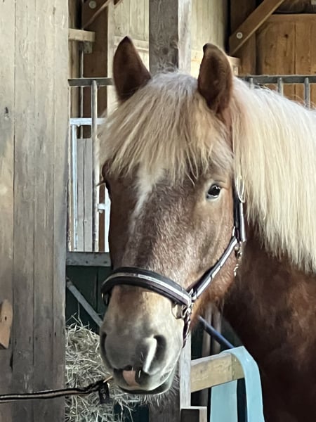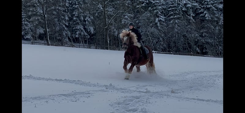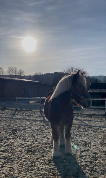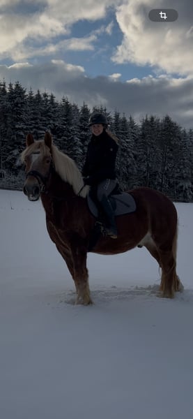 Schweren Herzens müssen wir uns von unserem 7-jährigen Kaltblut Wallach trennen. Er sollte uns auf unserem kleinen Ferienhof eigentlich in den Reitstunden für größere Jugendliche oder Erwachsene unterstützen, da er aber recht feinfühlig ist bei der Hilfengebung, ist er für unerfahrene Reiter aufgrund seiner Größe leider nicht einfach genug zu reiten. Er ist ein ganz Lieber, ist angenehm im Umgang und sehr verschmust. Leider geht er bei uns im täglichen Trott einfach ein wenig unter. Reiten in der Halle und auf dem Platz, Ausritte ins Gelände, Longieren, Geschicklichkeitsspiele, geführte Schritt-Ausritte mit Kindern, das alles macht er super mit. Er nimmt auch kleine Hindernisse mit großer Begeisterung. Unkompliziert bei Schmied und Tierarzt. Momentan steht er bei uns in einer großen Paddockbox mit täglichem Auslauf oder Weidegang. Läuft zur Zeit barhuf. Wir wünschen uns für ihn einen schönen Platz, wo er die Aufmerksamkeit bekommt, die er verdient. Allerdings wie schon beschrieben, aufgrund seiner Größe und Stärke (noch) kein wirkliches Anfängerpferd. Auf Wunsch kann gegen Aufpreis der angepasste Sattel und die Trense übernommen werden. Kennenlernen und Probereiten ist nach Absprache natürlich möglich.