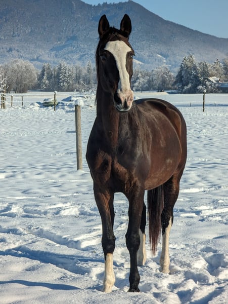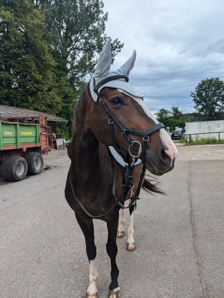 Description: I am offering my top-fit mare, "Poly's Miss Blue," for sale. She underwent a comprehensive health check (AKU) in October 2021. Poly is an energetic, sporty mare who has successfully competed and placed up to class L in show jumping in the past. Current Status: She has not been worked in show jumping over the past four years but remains in excellent physical condition and is still eager to move and jump. She has not forgotten her skills or her technique, and with appropriate training, she can certainly regain her former performance level or provide a dedicated rider with great pleasure as a high-quality leisure horse. Trail & Temperament: Poly is a loyal companion for her person. She is confident in the terrain but requires a firm, trusting handler. She needs someone she can trust 100%, and once that bond is established, she is a lifelong partner who sticks with you through thick and thin. Details: Sport: Successful in show jumping class L (currently on a break). Type: Sporty, energetic, willing to work, focused, always eager to please, and giving her best. Health: In top condition, no known issues. Special traits: Seeks a close bond with a consistent handler. Summary: Poly is not a horse for quick tournament success overnight but a true gem for someone willing to retrain her or looking for a sporty partner for daily work and trail riding.