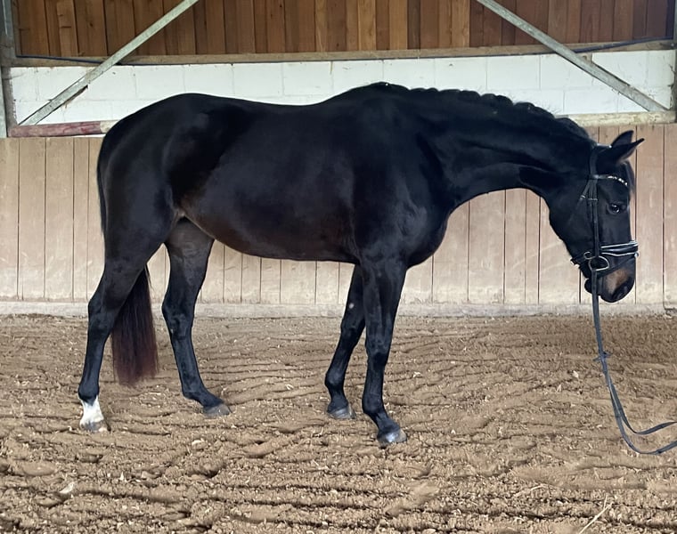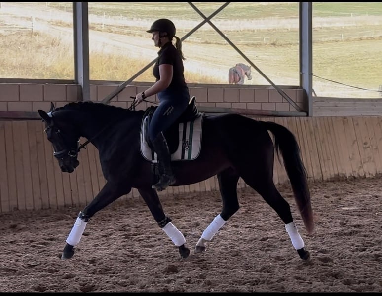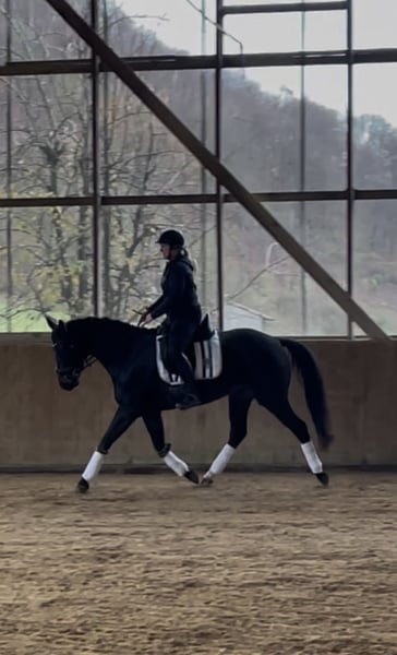 Directly from the breeder, Elli is looking for a new, loving home. Elli is a 4-year-old mare by Eckhardt x Granikos x Sherwood. Not only is Elli beautiful, but she is also absolutely rideable and clear-minded, with three very good gaits. She impresses with her rhythm and work ethic. Elli was started under saddle at the end of her 3-year-old year and has been out on the trails three times. After spending the spring in the pasture, she is now slowly being introduced to dressage work, making her ready for further training. She also shows talent over jumps, so nothing stands in the way of a versatile education. Elli goes out calmly in a group and alone in all gaits. Children, dogs, tractors, sheep, cows, etc. are absolutely normal for her. She has grown up in a herd environment with us and is well socialized. She is still growing at the moment. Mare, 4 years old 160 cm Eckhardt x Granikos x Sherwood ‼️ For serious inquiries, please call 0171/8353415‼️