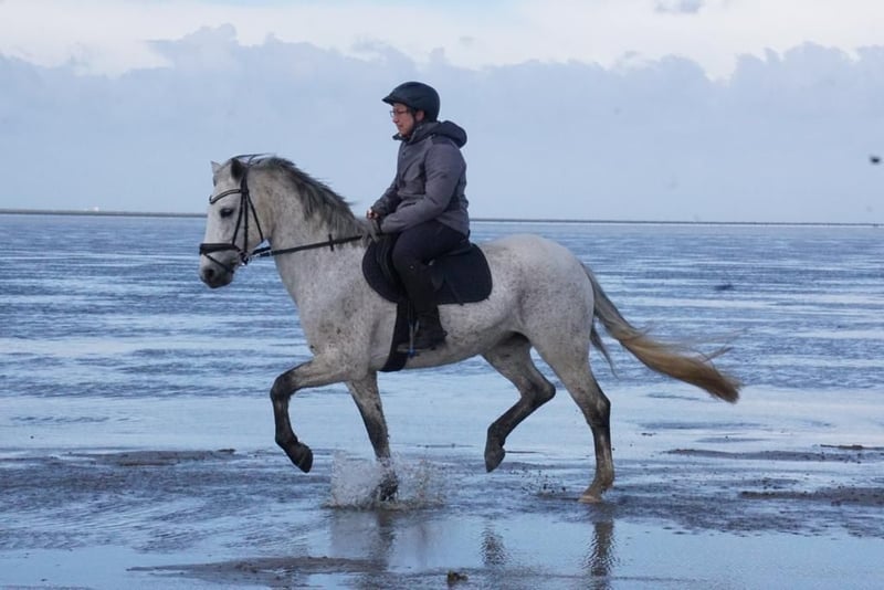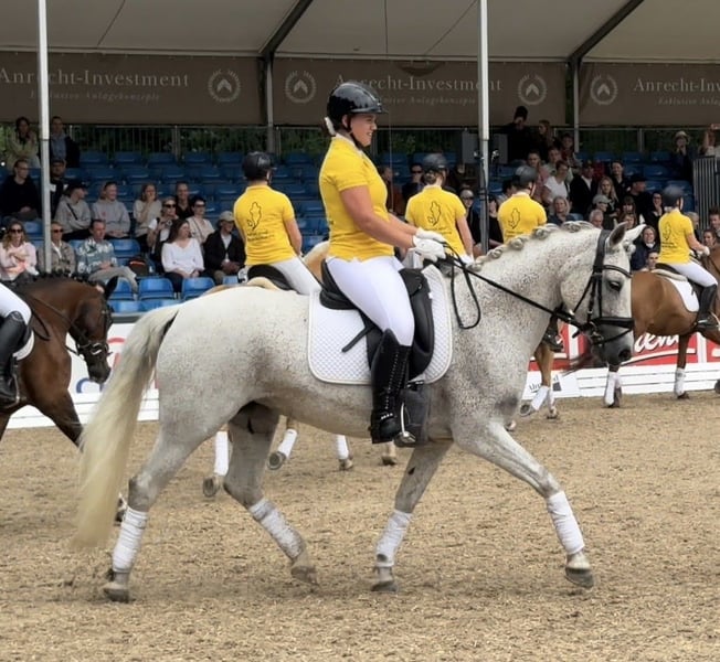 Zum Verkauf steht unsere charmante und leistungsbereite Reitpony-Stute Tine. Die 10-jährige Schimmelstute ist mit 1,48m eingemessen und stammt ab von Del Piero aus einer St. Annens Monsieur N-Mutter. Tine bringt beste Voraussetzungen für den Springsport mit und ist sofort auf Turnieren einsatzbereit. Tine ist brav, motiviert und sehr arbeitswillig. Sie verfügt über gute Grundgangarten, ist lernwillig und zeigt im Springen ihre große Stärke, dabei ist sie immer mutig, ehrlich und hat viel Übersicht. Aktuell ist sie sicher auf A*-Niveau ausgebildet. Zwei Starts, zwei Schleifen. Bei ihren bisherigen zwei Starts im E-Springen wurde Tine direkt beide Male platziert. Ihr tatsächliches Potenzial liegt jedoch deutlich höher, was sie besonders im Freispringen zeigt.. Auch dressurmäßig ist sie sicher auf A-Niveau ausgebildet, mit ersten Lektionen auf L-Niveau. Im Gelände zeigt sie sich ebenfalls brav und motiviert und ist somit auch für die Vielseitigkeit interessant. Ihre enorme Nervenstärke und Vielseitigkeit hat sie bereits mehrfach unter Beweis gestellt: Ein Highlight ist ihre Teilnahme mit der niedersächsischen Reitponyquadrille mit Auftritten u. a. beim CHIO Aachen, Hamburger Derby und weiteren großen Veranstaltungen. Reiturlaub oder Tagesausflüge ins Watt oder Wald und Wiese, mit Tine, kein Problem. Man kann sie an jeder Position ohne Probleme reiten. Eine Schritt Voltikür für die Weihnachtsfeier hat sie sehr brav absolviert. Es wurde zu zweit auf Ihr geturnt. Im Umgang ist Tine unkompliziert, verlade- und schmiedefromm und dabei typisch Pony – manchmal etwas frech, aber immer charmant. Tine ist kein Anfängerpony, sie benötigt einen sicheren, konsequenten Reiter. Mit weiterer Förderung ein echtes Toppony! Wir wünschen uns für sie ein liebevolles förderndes Zuhause, idealerweise springbetont. Verkauf nur an Privat Zubehör kann mit erworben werden. Hinweis zum Probereiten: Um Reittourismus zu vermeiden und im Sinne des Tierwohls, berechnen wir für das Probereiten eine Gebühr in Höhe von 50 €. Diese wird bei einem anschließenden Kauf selbstverständlich verrechnet.