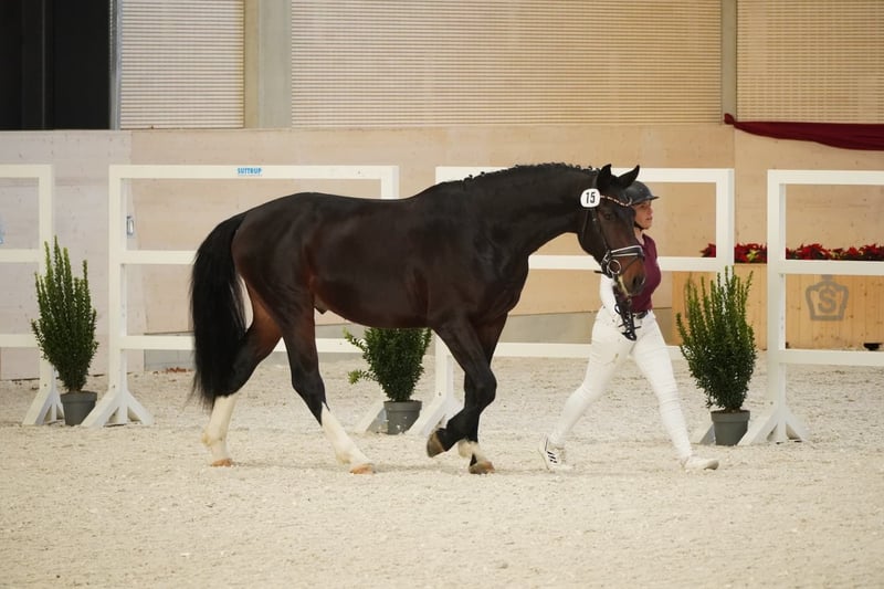 On behalf of the breeder, Lexters Leif, a heavy warmblood foal born in 2023, is being offered for sale. The charming dark bay stands at 16.1 hh and has a cannon bone circumference of 24 cm. He participated in the stallion days in November in Moritzburg, so he is currently still a stallion, but shows no stallion-like behavior. Leif has an excellent temperament, is completely fearless, and enjoys working. He impresses daily with his friendly nature, rarely becomes nervous, and therefore offers versatile potential for various disciplines. Thanks to his very good walk, a rhythmic trot, and a beautiful uphill canter, he would be an ideal partner for ambitious riders or drivers in the higher-level recreational riding sector. Due to his good musculature from preparing for stallion selection and the stallion days in Moritzburg, we tested him with rider weight. He proved to be well-behaved and very easy to handle. Please feel free to contact me for further information or to arrange a viewing.
