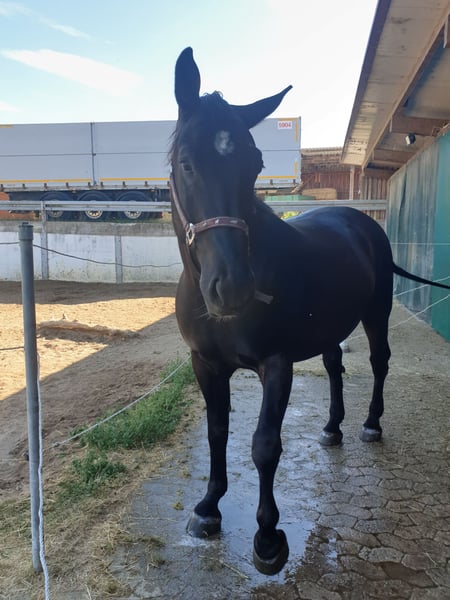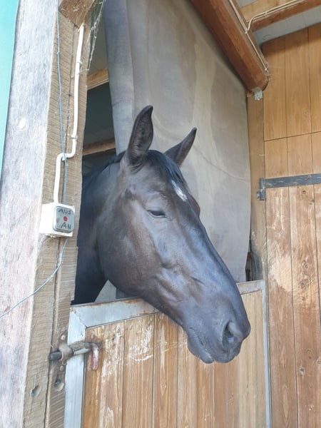 C'est à contrecoeur que nous proposons notre gros cheval Warmblood. Malheureusement, nous manquons de temps pour lui. Il nécessite une éducation ferme, sinon il prend le leadership. Sur le caractère, c'est un vrai bébé. Il fait tout pour une récompense. Cependant, il faut lui laisser du temps ! Nous le montons en manège et en extérieur, mais il préfère clairement l'extérieur !!!! Il lui faut encore de la routine ici, mais il n'est jamais tête brûlée et se calme rapidement lorsque le cavalier lui donne de la sécurité. Donc, il n'est pas adapté aux débutants absolus ! Il vit en paddock ouvert, ce que je souhaiterais à nouveau pour lui ! Pour toute question supplémentaire, n'hésitez pas à nous contacter ! Pour une séance d'essai avec le temps consacré, nous nous réservons le droit de facturer 25 euros. Il n'aime pas changer de cavalier.