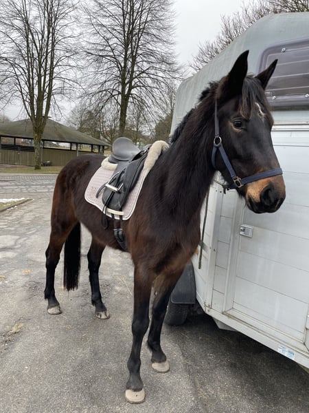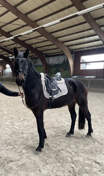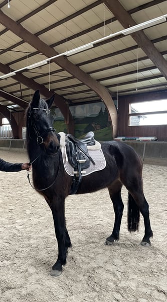 Te koop staat onze driejarige zware warmbloed merrie (Saksisch-Thüringisch zwaar warmbloed, Moritzburger). Haar vader is de prestatiehengst en Bundeschampion Loriot. Ze heeft momenteel een stokmaat van 1,65 m en is zeer typvol en sportief gebouwd. Haar uitstekende beweging en bereidheid tot presteren maken deze charmante en vriendelijke merrie bijzonder. Een ideale allrounder, geschikt voor zowel men- als dressuursport. Ze is voorzichtig in het terrein aangezadeld, kent uitritten in groep en solo, en beweegt onder het zadel in alle drie de gangen in het terrein. Tijdens het rijden toont ze zich altijd kalm en braaf. Geen enkele ongehoorzaamheid zoals bokken, steigeren, bijten of trappen. Zelfs als ze meerdere dagen niet gereden is, kan je gewoon opstappen en meteen rijden. In de bak en op het rijterrein heeft ze al haar eerste rondjes onder het zadel steeds met absolute rust en zelfverzekerdheid voltooid. In een vreemde omgeving blijft ze eveneens kalm. Ook het longeeren en grondwerk kent ze. Ze is regelmatig gevaccineerd, ontwormd en door de hoefsmid verzorgd. Haar tanden zijn recent verzorgd. Ze is schmied- en verladeerf en kent het verkeer op de weg. Sinds haar veulen leeft ze bij ons en is ze op een natuurlijke manier samen met haar leeftijdsgenoten opgegroeid in onze kudde. Ze is nog nooit ziek geweest, heeft nooit slechte ervaringen opgedaan en is zeer mensgericht. We verkopen haar alleen omdat we door een dubbele gezinsuitbreiding helaas niet meer aan haar verzorging kunnen voldoen. In de zomer heeft ze een lichte eczeem, dat met haar deken, die natuurlijk wordt meegeleverd, gemakkelijk te behandelen is. Ze heeft geen open wonden en heeft geen medicijnen nodig. Omdat ze nog geen slechte ervaringen heeft opgedaan en nog een jonge paarden is die verdere opleiding nodig heeft, willen we afzien van een proefrit.