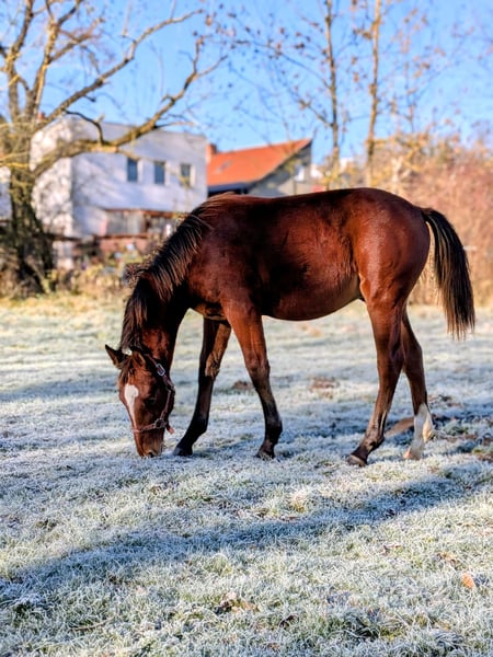 Van Helsing wurde bei uns geboren, sein Vater ist der im Landgestüt Moritzburg stationierte Valentino, seine Erfolgsliste bitten wir der Vollständigkeit halber auf der HP des Landgestütes Moritzburg nachzulesen. Seine Mutter brachte bereits 2 sehr bewegungsstarke Fohlen mit 9,5 und 8,5 in der Bewegungsnote zu Fohlenschau. Auch sie zeichnen sich durch einen freundlichen und sehr braven Charakter aus. Van Helsing selbst machte zur Fohlenschau den Pausenclown und zeigte sich für seine Verhältnisse eher unter seinem Niveau und erhielt 8,5 in der Bewegung, obwohl er über deutlich mehr Potential verfügt,das jedoch an diesem Tag nicht zeigte. Ausstrahlung und Präsenz verfügt er vom ersten Tag an und beeindruckt mit Mut,ohne Scheu nimmt er alle Aufgaben an und zeigt sich bis zum heutigen Tag überaus gehorsam. Er ist ein sehr unkompliziertes Fohlen, ist top halferführig,fürchtet sich nicht wenn er mal alleine ist und kommt mit allen Situationen mit Ruhe und Überblick seinerseits sehr gut klar. Wir sehen ihn ebenso im gehobenen Fahrsport, hier vielleicht sogar als imposanten Einspänner wie auch als tolles Reitpferd. Aufgrund des außergewöhnlichen Pedigrees seiner Mutter mit Anschluss an den englischen Vollblüter Signum xx vereint er sowohl die Vorzüge des Schweren Warmblüters wie auch die Leichtfüßigkeit, besonders in der Galoppade,des Vollblüters. Charakterlich hat er das unerschütterlich coole Temperament des Schweren Warmblutes, keine Nervigkeit und keine Spinnereien.