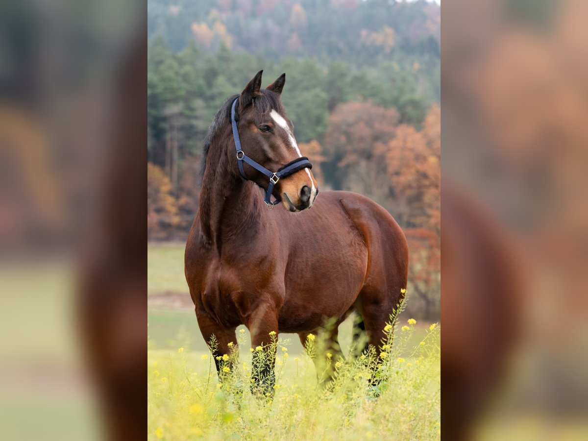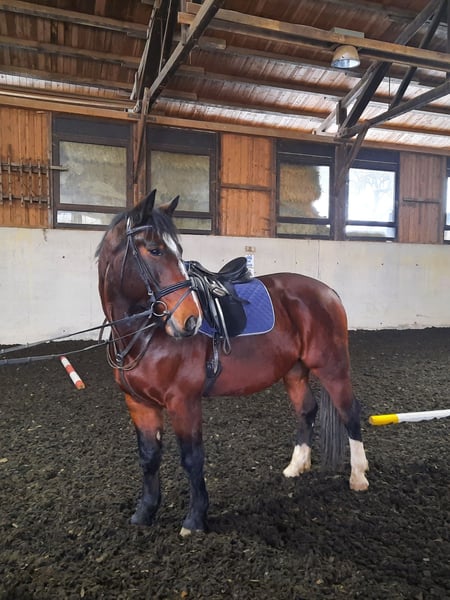 🐴 Braver brauner Wallach sucht liebevolles Zuhause 🐴 Wir sind ein Voltigierverein (kein Reitschulbetrieb) und müssen uns leider schweren Herzens von unserem noch 11-jährigen Wallach (sächsisch-thüringisches schweres Warmblut) trennen, da er zum Voltigieren nicht so geeignet ist, wie wir uns das vorstellen. Er hat ein Stockmaß 168 cm und ist vorne beschlagen. Er ist sehr brav im Umgang, unkompliziert im täglichen Handling (schmiede- und verladefromm) und angenehm zu reiten. Er kennt Bodenarbeit, Longieren sowie Freispringen und ist vielseitig einsetzbar - für Dressur und Springen aber auch im Gelände. Er lernt sehr schnell, freut sich über neue Aufgaben, ist offen für Neues, sehr interessiert und macht beim Training viel Freude und möchte immer gefallen. Als Freizeitpferd ist er bestens geeignet!! Aktuell befindet er sich tagsüber in Offenstallhaltung und nachts in einer Box. Dies würden wir uns auch weiterhin für ihn wünschen. Uns ist es wichtig, dass er in gute Hände kommt. Deshalb erfolgt keine Abgabe an einen Händler. Ratenzahlung ist leider nicht möglich. Probereiten kann gerne bei ernsthaftem Interesse nach vorheriger Terminabsprache vorgenommen werden. Aktueller Standort: Kulmbach / Mainleus Preisvorstellung: 6.500 € Wenn Du Dich angesprochen fühlst und unseren Braunen kennen lernen möchtest, melde Dich gerne bei uns.
