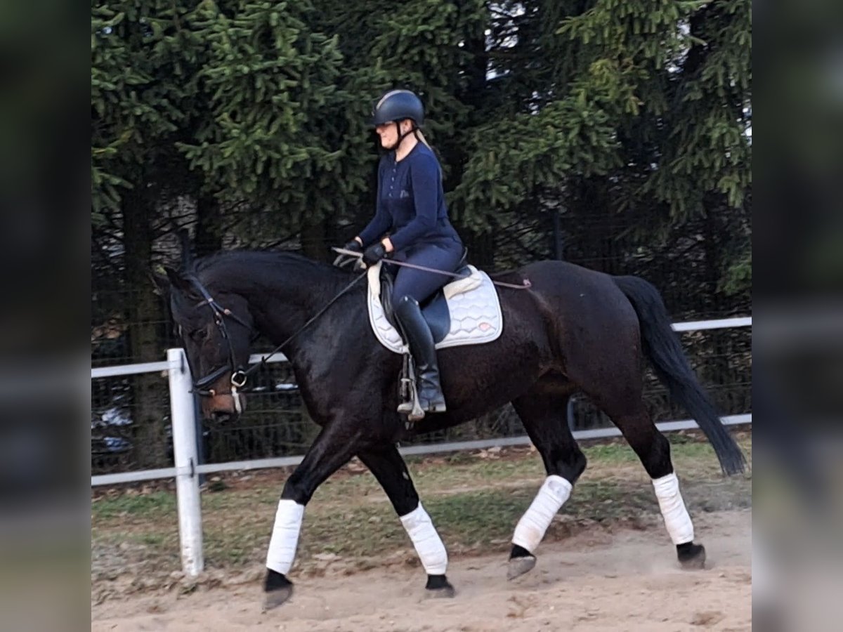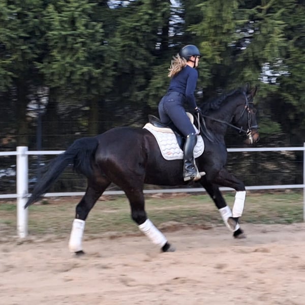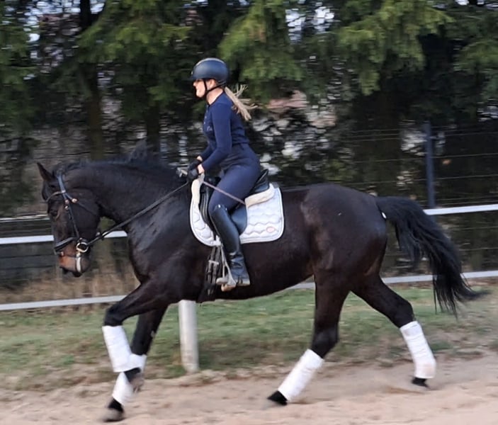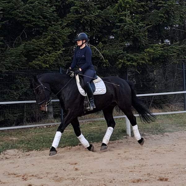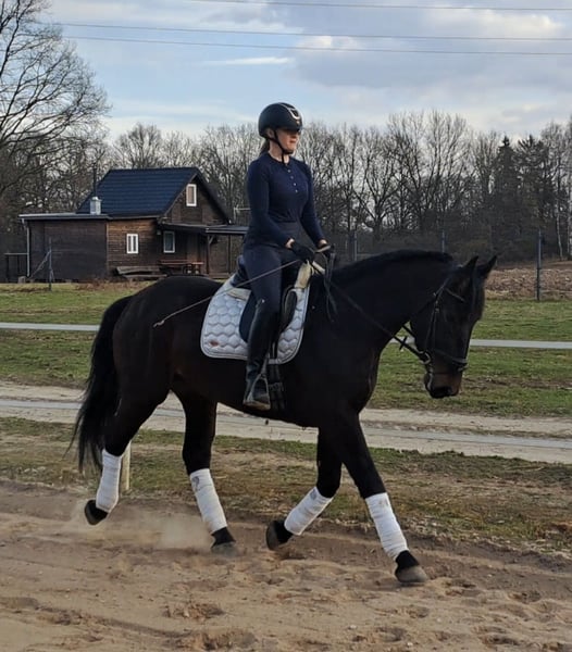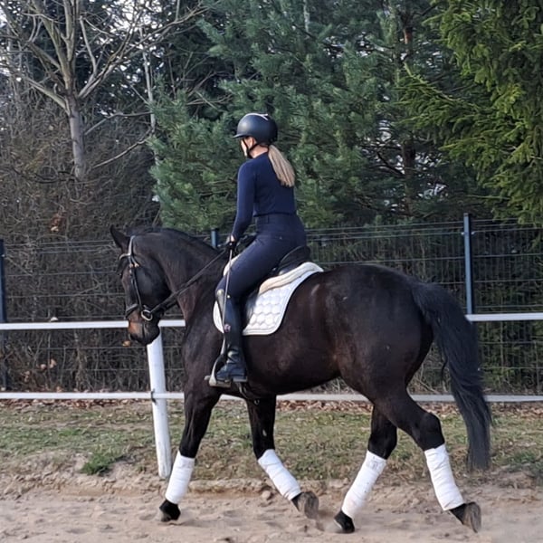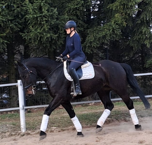 Afrodyta – Schlesian mare with full pedigree and main studbook registration 4 years old, 16.1 hh (168 cm) tall. She is a beautiful Schlesian mare, born in 2022. With her elegant dark coat and a height of 168 cm, she is not only a striking appearance but also a lovely dressage horse. She is also trained to drive and has been driven in a two-in-hand. This mare is characterized by her friendly and outgoing nature. She is well-behaved, easy to handle, and familiar with dogs and cats. Her movements are supple and expressive. A great leisure horse. The mare is healthy, barefoot, and herd-friendly. If you are interested or have further questions, please feel free to contact me. Visits and trial rides are possible by arrangement.