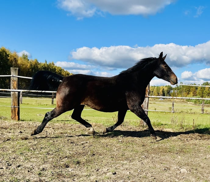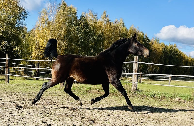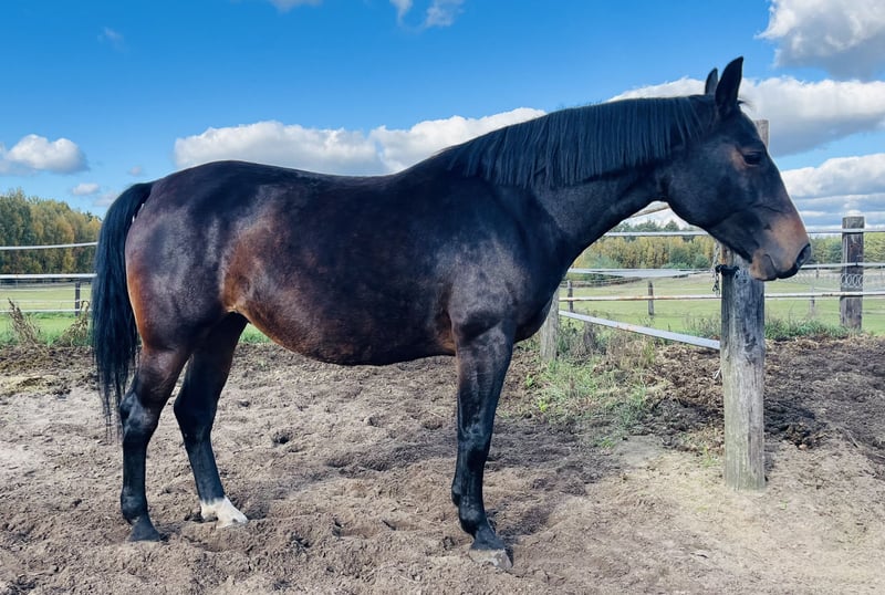 For sale: a beautiful Silesian mare! We present an exceptional Silesian mare born in 2017. She has a stunning dark bay coat and stands approximately 16.9 hh. The horse is friendly and easy to handle, with a gentle temperament. She is currently pregnant by the grey stallion Akropol, sired by Eckermann. Ideal for breeding, recreation, or sport. Please feel free to contact us and arrange a viewing!