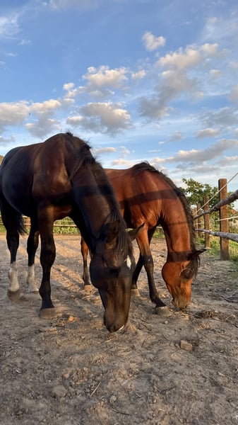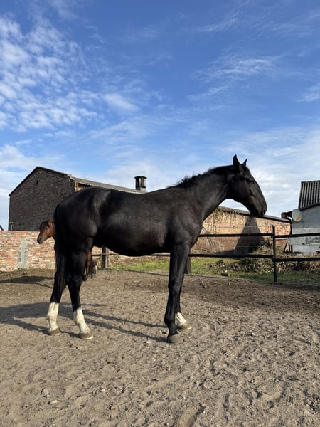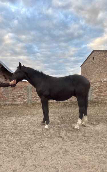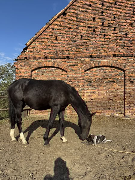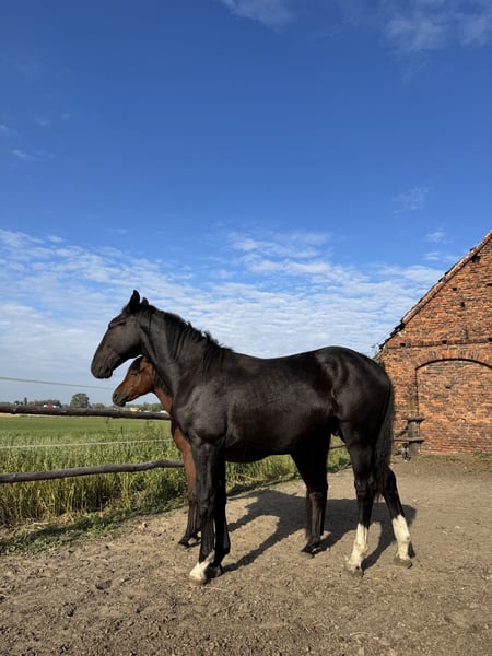 Silesian stallion, one and a half years old. Very friendly and curious. Always approaches people in the paddock. Daily turnout. Beautiful coat color - 3 socks and a star on the forehead. Unique sheep nose. Regularly trimmed. Current height: 155 cm. Will be a tall horse. I will send videos via SMS/WhatsApp. Father is in the second to last photo and mother is in the last one. Father's height is 165 cm. Mother is 168 cm.