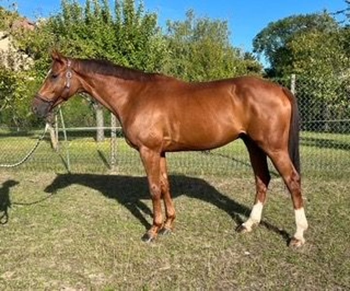 Este es un caballo gelding de 9 años de raza Selle Français, con una altura de 1,70 m (17 manos). Graham es un caballo muy inteligente; no deja a nadie indiferente, como lo puede confirmar cualquiera que haya cruzado su camino. Es muy fácil de montar, siempre dispuesto, juguetón y lleno de travesuras. Además de su carácter increíble, es un caballo de alto rendimiento, independientemente de la disciplina. Después de ser madre, dejé de participar en concursos de eventing y comencé a competir con él en doma clásica, donde obtiene buenos resultados en clases amateur 1GP. Se puede montar con una cuerda de cabestro, una brida simple de bocado o una doble brida (para mejorar la recogida). No hay lucha de poder con un caballo como él. Graham solo irá a un buen hogar; no puede estar en un box cerrado. Es muy sociable y juguetón con otros caballos, y vivir en grupo le va muy bien.