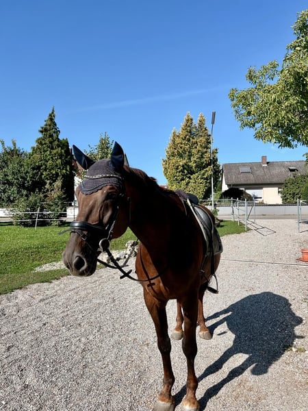 Schweren Herzens haben wir uns dazu entschieden unseren Wallach Merlin zu verkaufen. Merlin ist ein 16-jähriger Selle Francais mit einem Stockmaß von 1,70 m. Er ist regelmäßig entwurmt und geimpft worden, schmiede- und verladefromm und die Zähne sind auch regelmäßig gemacht worden. Merlin ist nicht beschlagen. Aufgrund seiner Arthrose ist er nur bedingt belastbar und wird ausschließlich als Freizeitpferd verkauft. Merlin ist aufgrund seines dominanten Verhaltens kein Anfängerpferd. Im Umgang sowie beim Reiten ist er brav, dennoch testet er gerne mal aus. Merlin geht sowohl alleine als auch in der Gruppe ins Gelände. Er kennt Longieren, Doppellonge sowie Bodenarbeit. Merlin ist bis L-Niveau ausgebildet. Wir wünschen uns, dass er in Allerbeste Hände kommt wo er die Aufmerksamkeit bekommt, die er verdient hat und bis zu seinem Lebensende bleiben darf. Er wäre der ideale Partner für Freizeitreiter, die am liebsten einfach eine Runde ins Gelände gehen möchte. Da wir die Erfahrung gemacht haben, dass das Probereiten gerne ausgenutzt wird, nehmen wir für das Probereiten eine Gebühr von 30€. Daher bitte nur bei ernsthaftem Interesse anfragen.