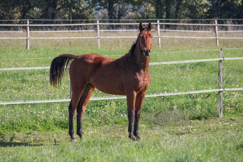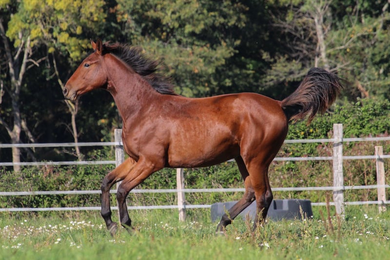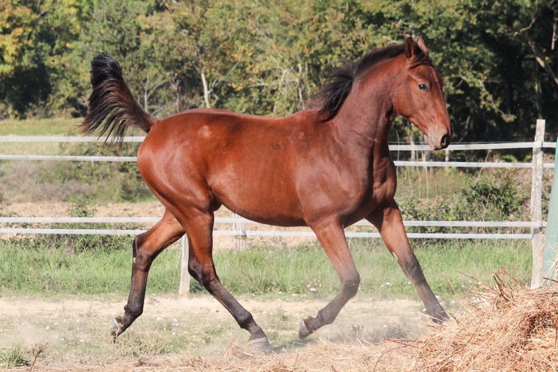 2024 foal, gelding, Selle Français, bay without white markings O'Malley has an excellent temperament—calm and straightforward, he learns quickly. He is handled regularly, stands for farrier, and loads properly. Up-to-date with deworming and vaccinations. He is a young horse very close to humans, eager to learn. He has good bone and frame, solid conformation, and beautiful gaits. He lives out in a herd pasture 24/7. Genetically, his sire is SAN MUSCADET (SIR DONNERHALL x PLACIDO), an Oldenburg stallion trained at a high level before an injury limited him to breeding. His offspring are versatile and suitable for all three disciplines. San Muscadet is available for viewing on-site. On the dam side, he descends from Rhodésie d'Acy (Pamphile x Le Tot de Semilly), ISO 120, a mare that competed successfully at 120-125 show jumping. The maternal line includes many competitors who have jumped over 130. His fourth dam is DANAE, dam of HILDA DU MESNIL, dam of REINE DU MESNIL, herself the dam of the very good BALADINE DU MESNIL ISO 181. I highly recommend coming to meet him in person to better appreciate his character and potential.