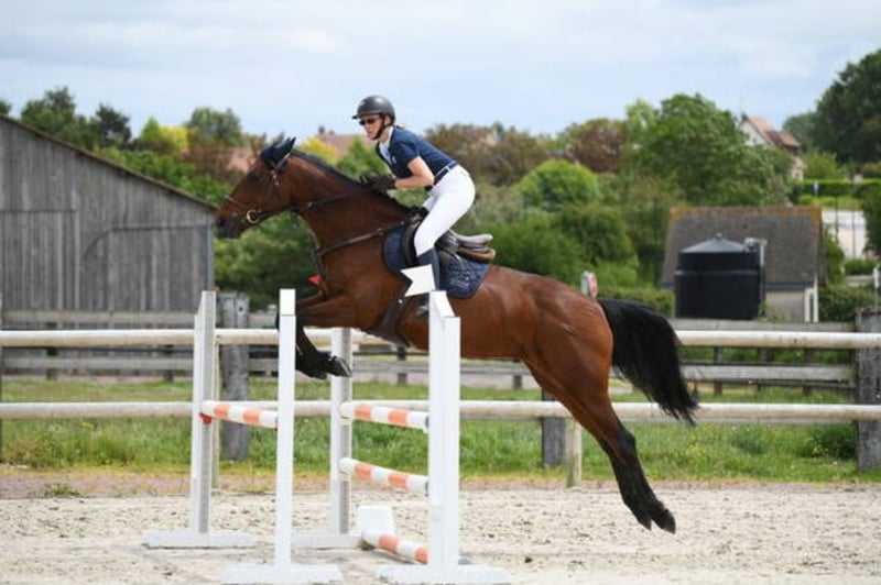 Delorean Taroy, jument SF de 13 ans, 1m65. Très beau papier ! Jument calme, de bons moyens à l’obstacle (130cm à terme), très respectueuse. Sort seule en extérieur. Idéale pour un cavalier amateur ou pour passage poney/cheval. Sort actuellement sur 105cm. Ok tonte et transport. A jour de tout : vermifuges, vaccins (TGRh), maréchal, dentiste et ostéo. Visible et essayable dans le Calvados (Normandie) Infos, vidéos et photos supplémentaires sur demande.