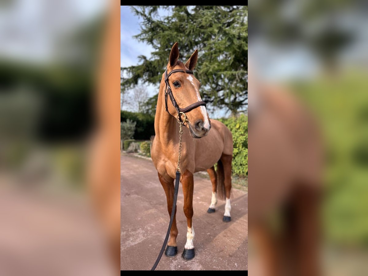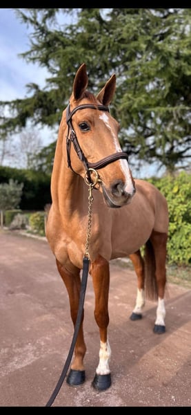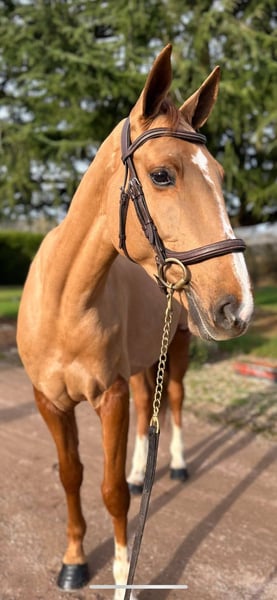 Lithuanie des perriers – selle français – 5 ans – alezane – Toise 162 cm. Par Ulyss morinda X C Indoctro C’est une jument avec de vrais moyens pour le CSO. Actuellement prête sur un petit parcours, elle se montre particulièrement franche et démontre un top respect de la barre. Très prometteuse, elle va être très concours et saura ravir son futur cavalier par son envie de bien faire. Extérieur : Sort seule ou accompagnée, elle est sereine en balade. Soins : Très facile au quotidien (tonte, transport, maréchal, marcheur). Mode de vie : Actuellement en boxe avec sorties quotidiennes au paddock avec des congénères. Santé : À jour de tout (vaccins, dentiste, ostéopathe).
